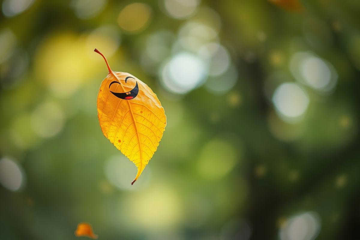 a falling,happy leaf,mid-air,laughing. bokeh,blurry background