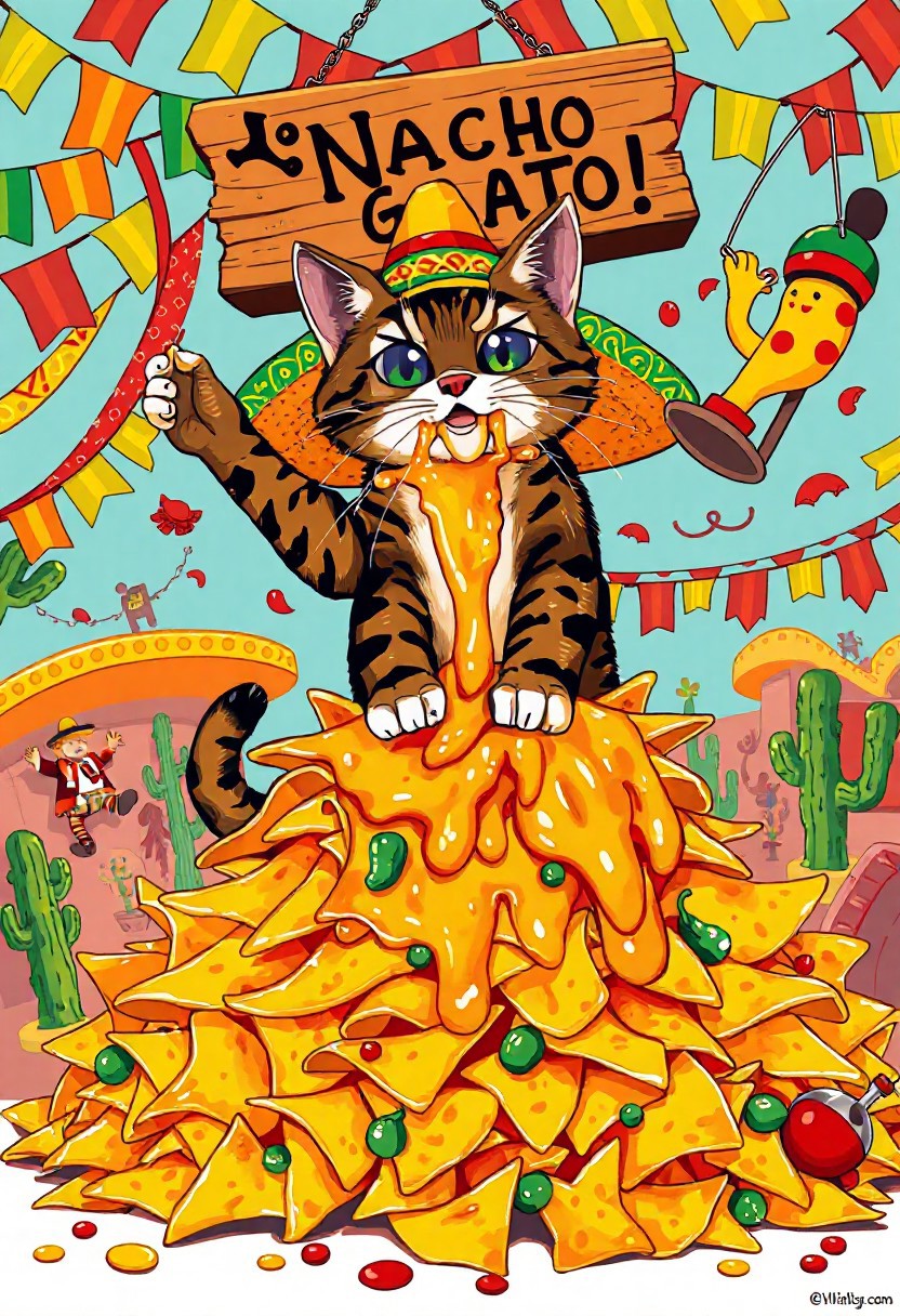 Vector flat Mexican style art Poster, A mischievous tabby cat wearing an oversized, brightly colored sombrero adorned with tiny chili pepper ornaments sits triumphantly atop a towering mountain of cheesy nachos. The chips buckle under neon-orange melted cheese that oozes like lava. The cat, with sparkling anime-style eyes the size of tortillas, swipes a nacho with dramatic flair, flinging cheese onto its whiskers in a gooey mess that stretches cartoonishly as it frantically licks it off. Behind the chaos, a vibrant Mexican fiesta bursts to life papel picado streamers flutter in reds, greens, and yellows, while googly-eyed piñatas shaped like cacti and mariachi figures dance and cheer. A hand-painted wooden sign reading “¡Nacho Gato!” swings crookedly above, caught in the festive whirlwind. Scattered below are salsa spills, a runaway jalapeño, and a toppled maraca. Rendered in a vivid Mexican folk-art style with bold outlines and Talavera-inspired patterns, the scene pops with fiery reds, sunny yellows, and deep azules—perfectly capturing the wildly whimsical spirit of a feline fiesta gone hilariously off the rails.