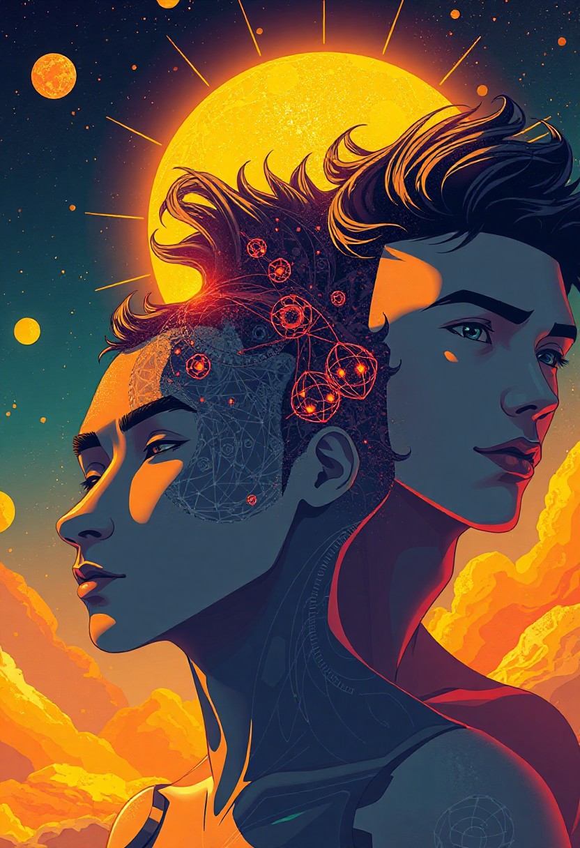 Illustration of 4 quintessential young men, residing in the realm of fantasy, their silhouettes traced out of trim wire and cutting-edge robotics and atomic particles , embodying an exotic and alien persona, adorned in radiant cosmic hues, their otherwise delicate skin bathed in a soothing wash of solar warmth exposing their intricate cellular construction beneath, their countenances acting as a dynamic muse, articulating a range of emotions through dramatic
