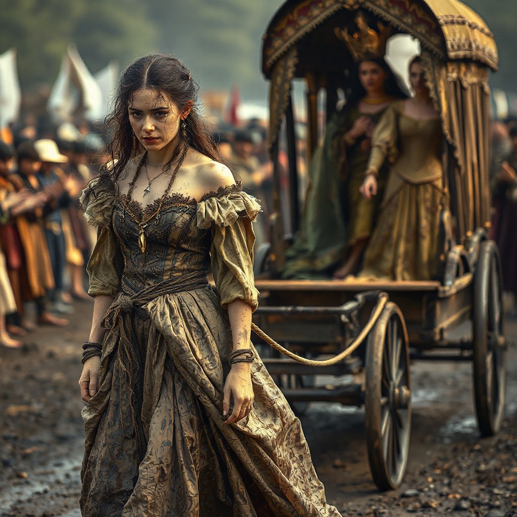 beautiful defeated and captured queen pulled behind a cart by leash around her neck, wearing muddy royal gown, disheveled hair, hands tied behind her back. behind her in a carraige, the victorious queen in magnificent robes, standing, arms out, accepting praise
