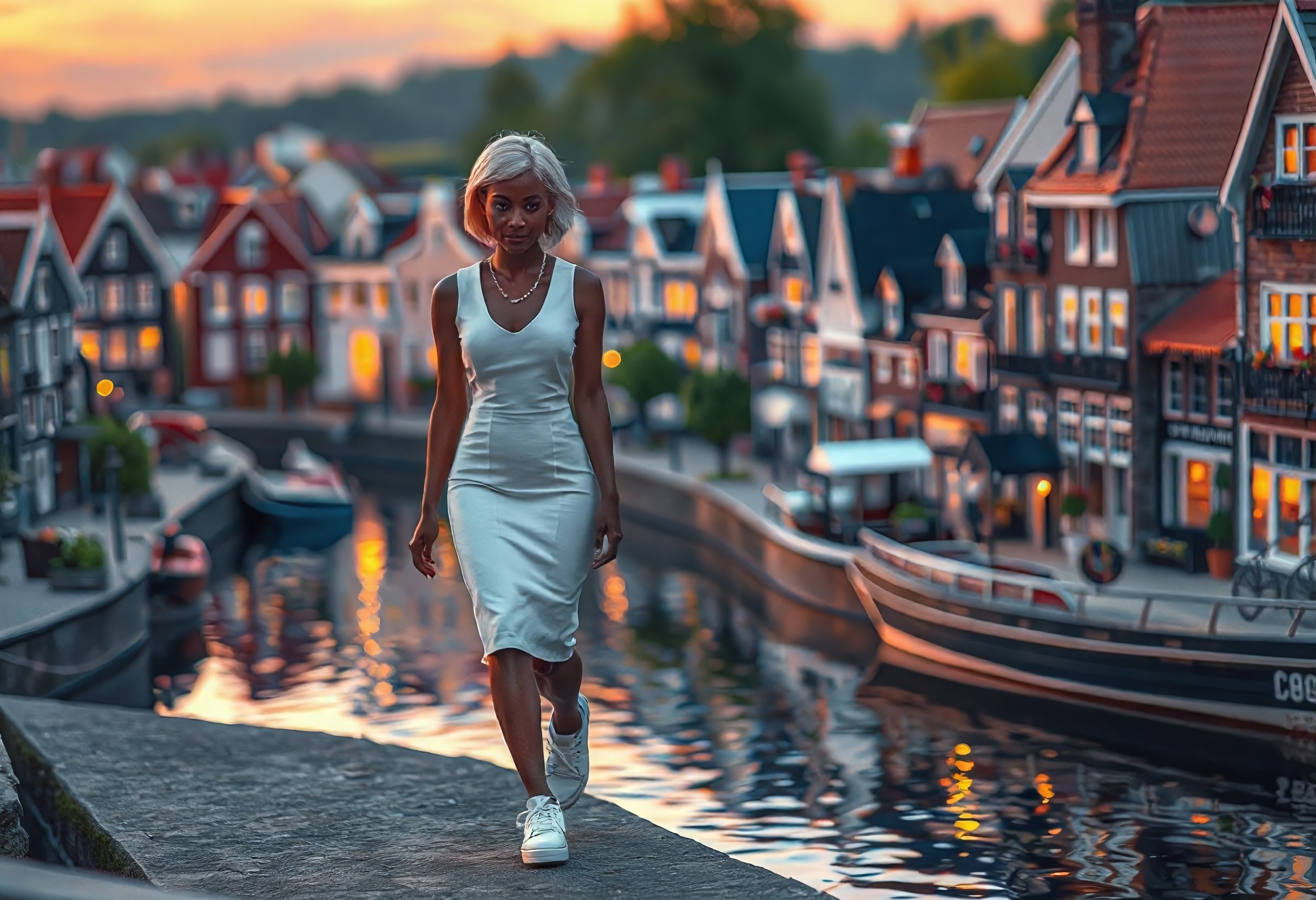 a woman walks in a miniature city. the wamon has blond realy short hair and a afrocan tone. she is wearing a white thight dress that ends at the knee. her white sneakers in 70ts style and her short knockle glowes ar contrasting her dark skin. around her is a colorfull miniature village on the water and in the traditional style around 1900 in netherlands. buildings are a bit smaller then the woman and the miniature land is build and colored like a detailed wax paint drawing. making the realistic photo looking like a painting but with a real person in it. it's a dynamic scene on a warm summer evening with detailed shadows and eye catching sunset.