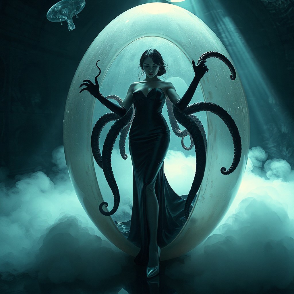 noble norvegian femme fatal lady standing struggling with tentacles holding her and pulling her inside hole in giant transparent slime egg, wearing evening GLOSSY THIN black slime live tentacles gown, GLOVES and high heels, , surrounded by weird fog from the floor, captured in light beam from celling, alien breeding chamber, , portholes to outer space, ultrathin waisT, HORROR, reminiscent of H.R. Giger, Zdzisław Beksinski, and Ash Thorp's dark, sleek styles, with close-up glamour photography, glossy satin and silver heels glistening, fleshy slime dripping, and dark shadows.