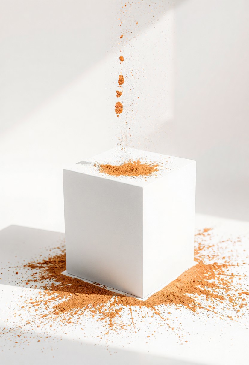 A white cube on a white background, bronze powder falling onto the cube, dramatic crisp light,