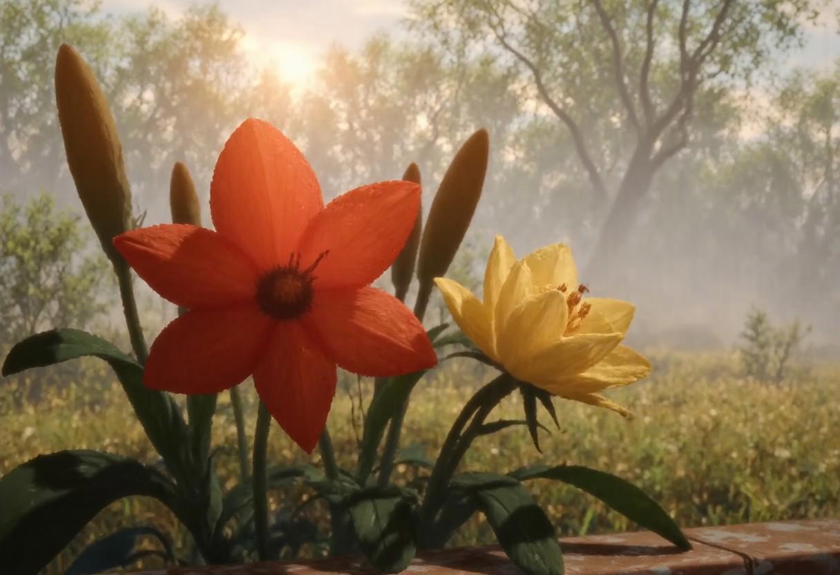 RARBC A photorealistic still life of vibrant flowers and foliage, styled as a masterful watercolor painting with layered textures and light washes. At the heart of the composition: a radiant red flower in full bloom, its petals velvety and gently curled, catching soft highlights like silk in golden sunlight. Nearby, a yellow blossom glows with warm hues, its center delicately detailed, as if dusted with pollen. Rich green leaves surround the flowers — some crisp and veined, others curling at the edges with painterly softness. The arrangement rests in a serene natural setting, with blurred botanical background elements suggesting a garden or wild field kissed by morning mist. Water droplets shimmer on petals and leaves, rendered in translucent glazes. Fine color bleeding at the edges evokes the softness of true watercolor on cold press paper. The lighting is luminous and natural, with depth-of-field focus, subtle lens flare, and gentle sunbeam diffusion adding a photographic realism that bridges classic still life with contemporary art Whimsical, storybook-inspired folk art with flowing, dreamlike details.