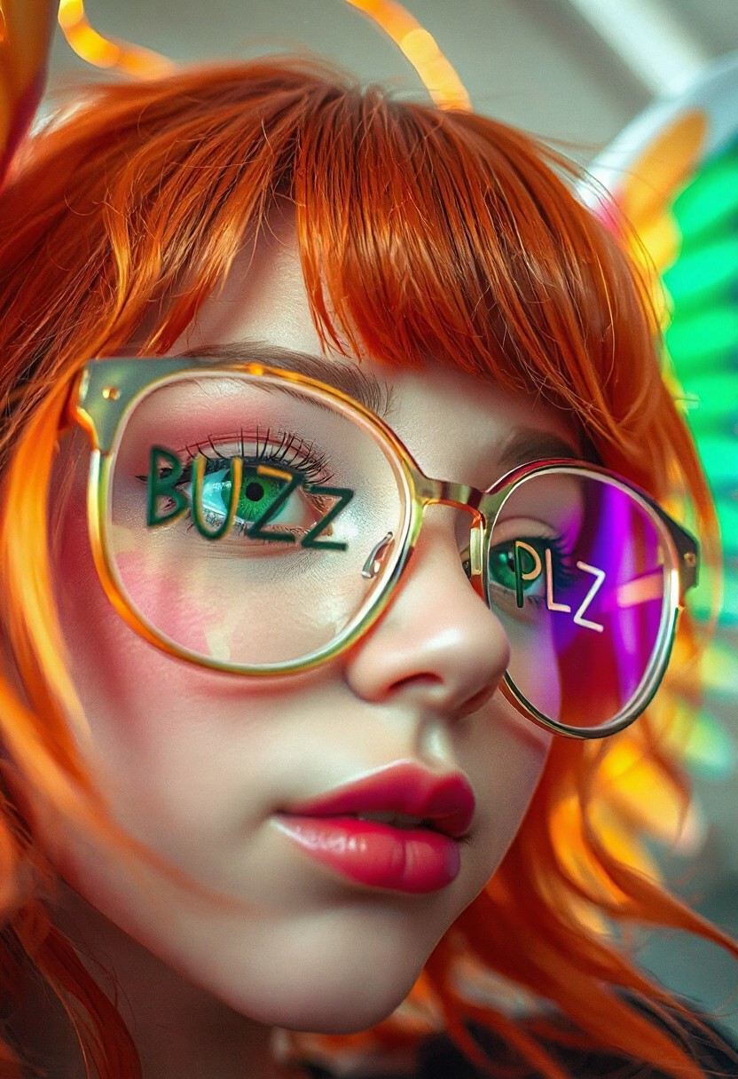 words on glasses "BUZZ" "PLZ", masterpiece, best quality, good quality, very aesthetic, absurdres, newest, 8K, depth of field, focused subject, close up, stylized, in gold and neon shades, wabi sabi, 1girl, orange hair, green eyes, rainbow angel wings, dynamic angle, from below, from side, relaxing