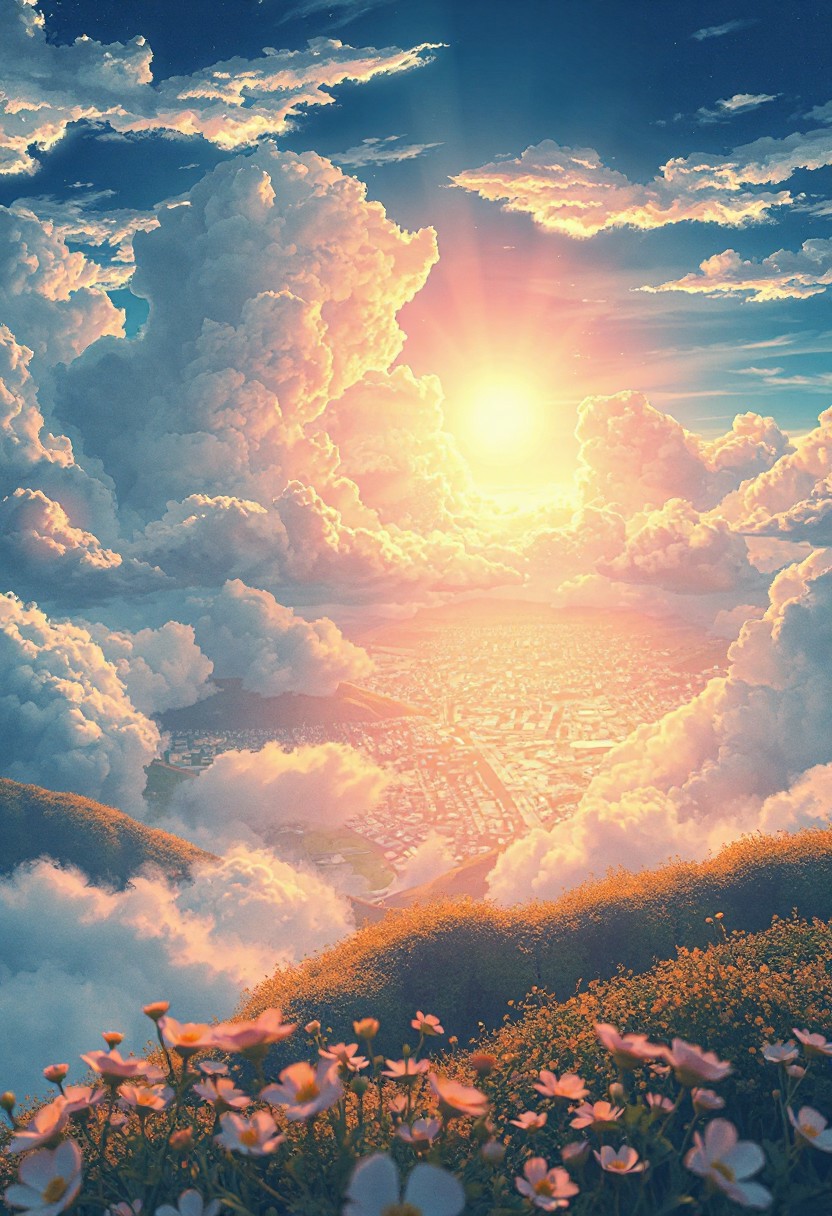 Vertical 9:16 cinematic anime scene, mountaintop view over a glowing city in the distance, slow-moving layers of clouds with dynamic texture and volume, sunlight piercing through in brilliant shimmering rays, soft glow illuminating the hills and rooftops below, flowers gently swaying in the foreground, pastel golden hour palette with blues, soft oranges, and warm pinks, ultra-detailed anime watercolor style, dreamy and emotional motion atmosphere.