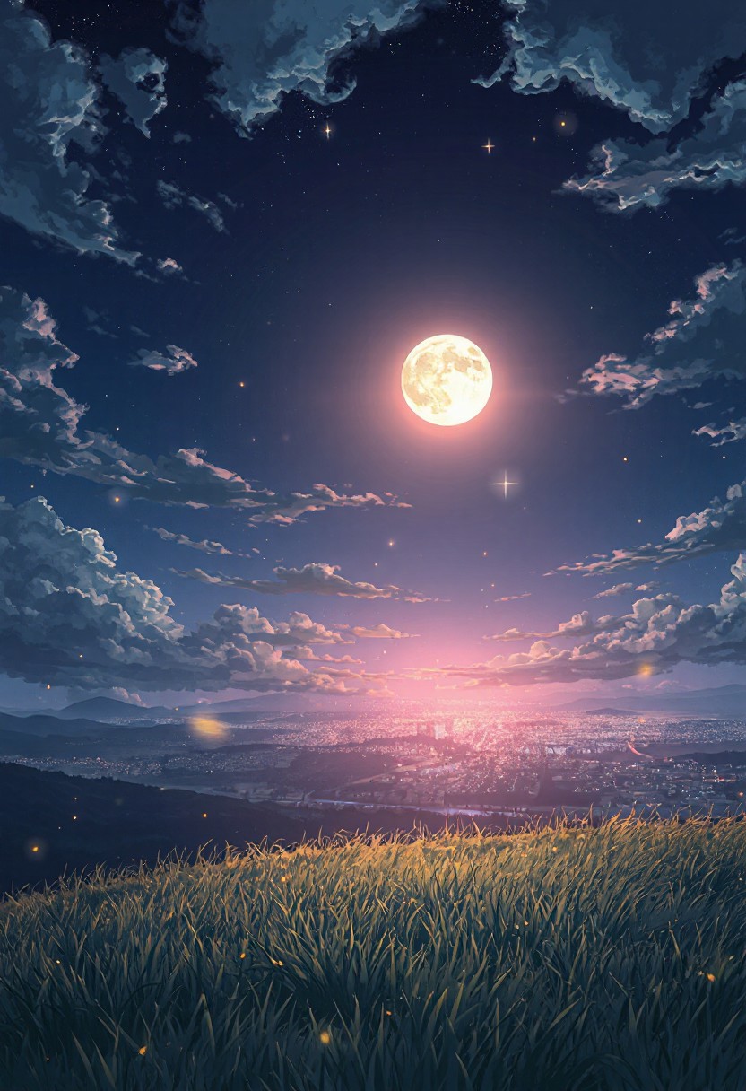 Anime night scene from a grassy hill, slow drifting clouds parting to reveal a glowing full moon, faint flickering stars begin to shimmer, fireflies floating softly near the ground, distant city lights twinkling far below, soft purple-blues and silver light, deeply emotional, ultra-detailed. Inspired by: The Place Promised in Our Early Days