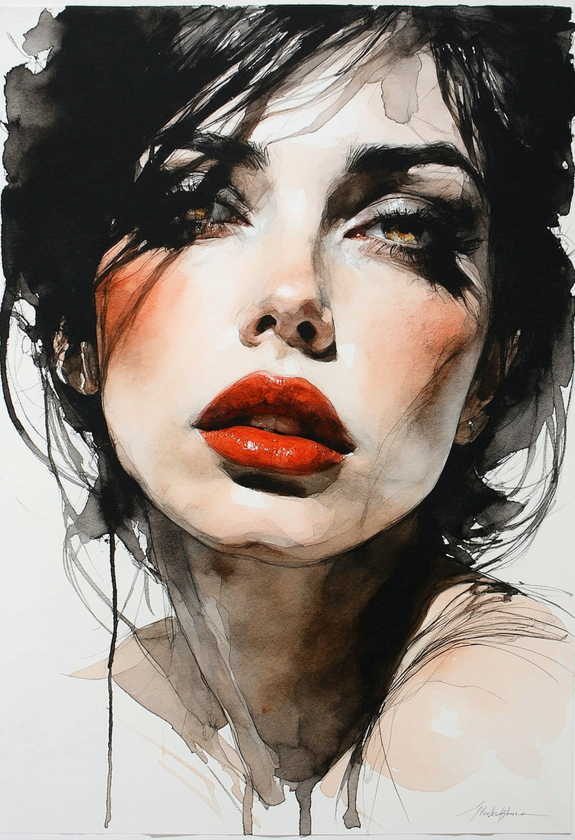 Ink art, watercolour, charcoal, realistic style. Petulant ingénue, sultry pout, teasing gaze directly challenging viewer. Intimate extreme close-up on expressive eyes, lips. Smudged charcoal background. Artistry evokes Egon Schiele's raw linework, Arthur Rackham's delicate watercolour washes. Soft directional light creates subtle chiaroscuro. Desaturated earth tones, stark black ink, muted crimson lips. Velvety charcoal smudges, translucent watercolour bleeds, matte paper. Playful defiance, intimate provocation: wisps of stray hair, knowing glint in her eyes.