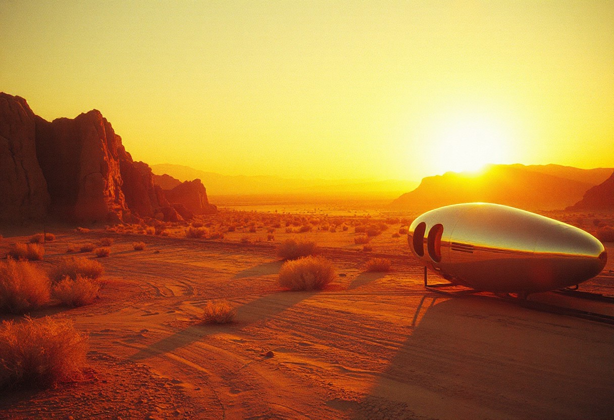 avant-garde, retro futurism , gold and chrome, california desert,sunrise, 1970s, robert T, techno style