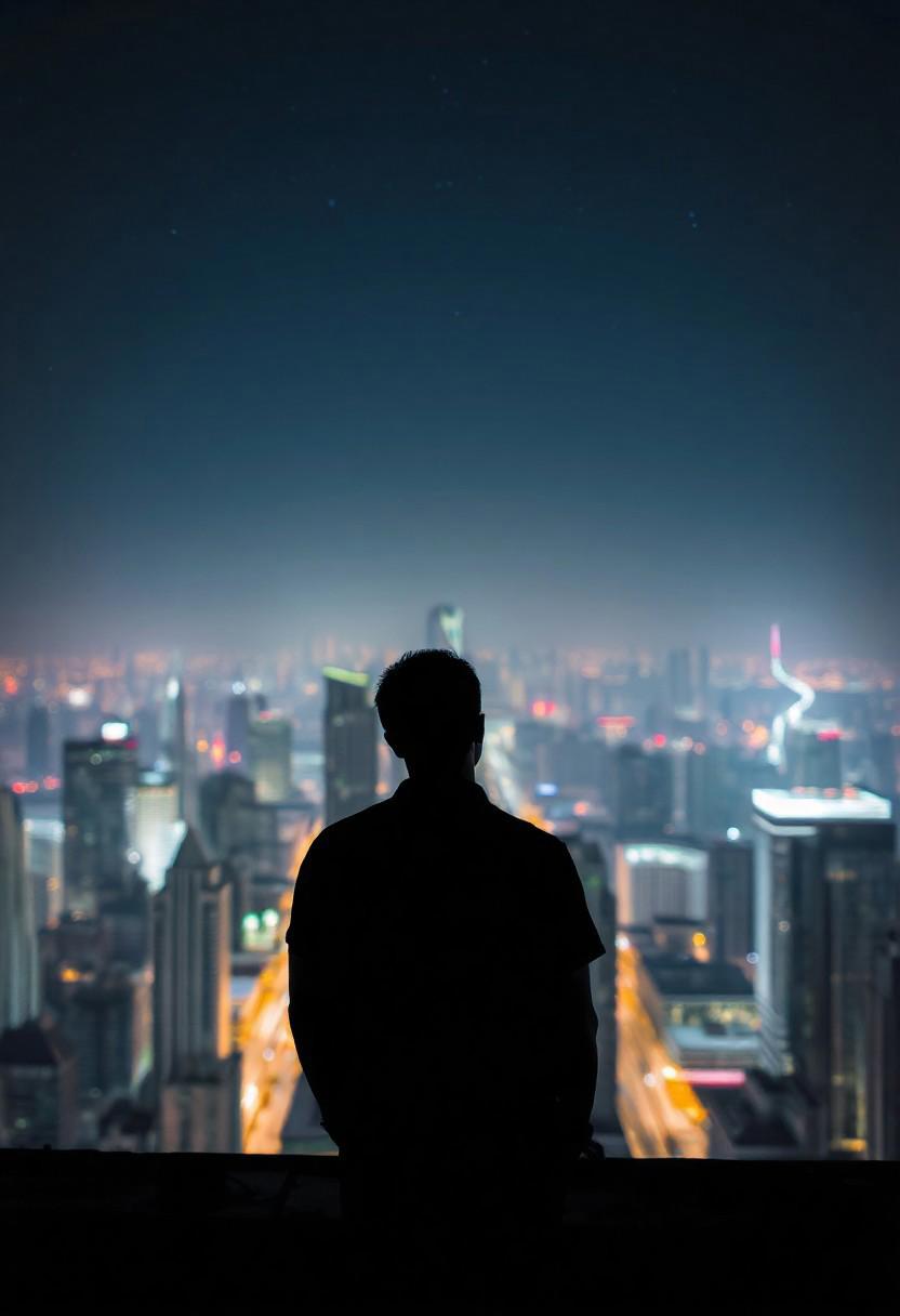 Frame the silhouette of a lone figure, gazing out at a breathtaking cityscape from a rooftop vantage point. The surrounding city stretches before them, an expanse of towering skyscrapers reaching for the starry sky. To capture this captivating scene, use a full-frame DSLR camera, such as the Canon EOS 5D Mark IV, paired with a telephoto lens, the Canon EF 70-200mm f/2.8L IS III USM, to compress the perspective and emphasize the striking silhouette. Set your camera to a long exposure of 1/10s to blur the city lights, infusing the urban landscape with a soft, ethereal glow that adds a dreamlike quality. Focus intently on the contemplative expression of the figure, their thoughts reflected in the vibrant skyline, and use a shallow depth of field to separate them from the background, highlighting their peaceful posture. The city lights transform into delicate bokeh balls, enhancing the magical atmosphere. For a stunning 4K wallpaper, enhance the contrast between the dark silhouette and the bright city lights, creating a dramatic visual impact. Boost clarity and sharpness to emphasize the intricate details of the skyscrapers and the serene solitude of the figure. The cinematic lighting, with warm tones and soft shadows, adds depth and emotion, inviting viewers to envision themselves in a tranquil moment of reflection, high above the vibrant heartbeat of the city. by Michael Kenna.