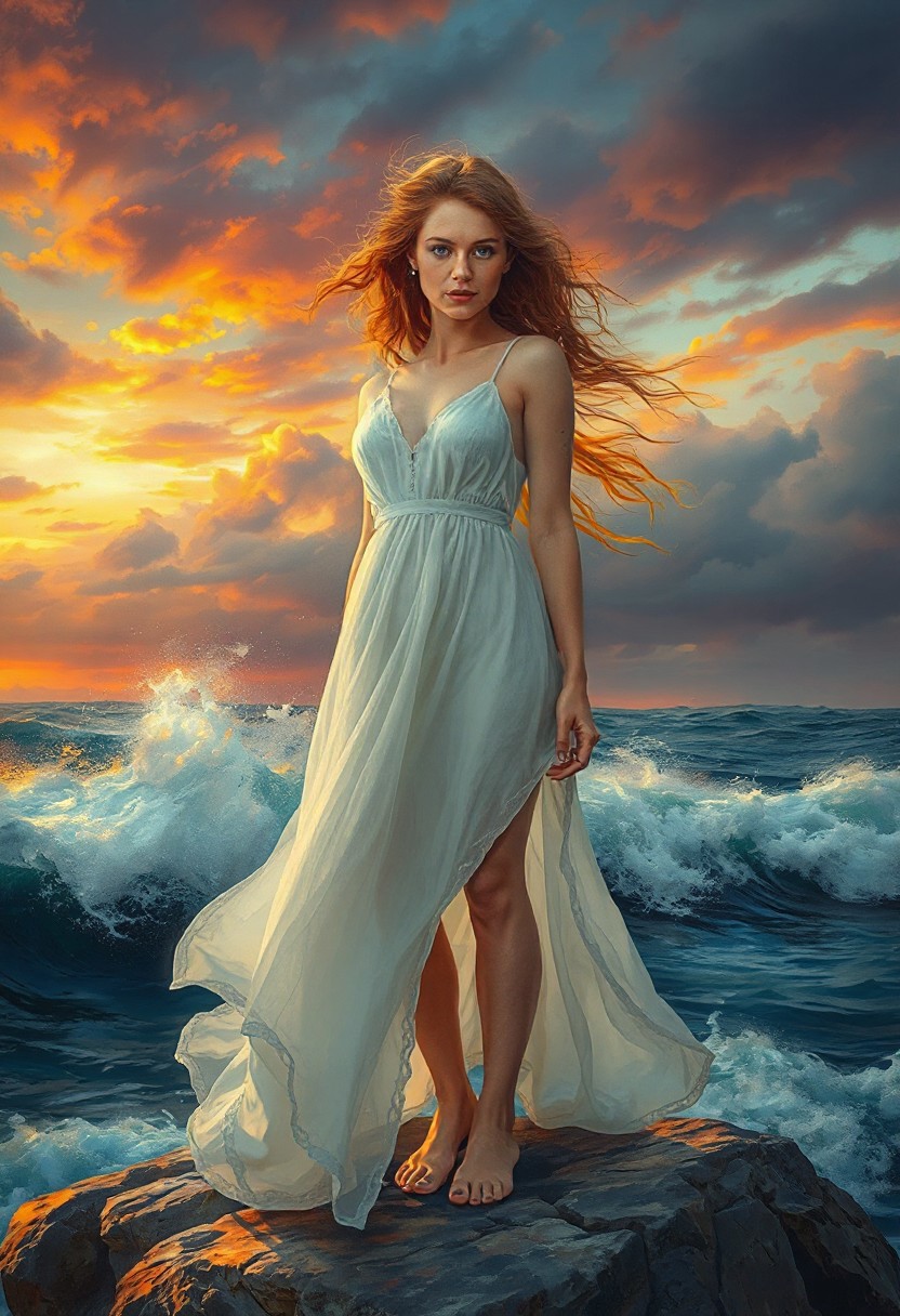 score_9, score_8_up, score_7_up, detailed masterpiece, (maxfield Parish style painting:0.9), 1woman, 25 years old, tall slender redheaded woman standing on a large rock in the ocean, sunset, stormy sky’s, large windblown waves:0.8, colorful sunset sky, looking at viewer, perfect pale white skin, cute face, Scandinavian features, big blue doe eyes, full pouty lips, swarthy, sultry, detailed ginger windblown hair with white highlights, long flowing sheer white dress blowing in the wind, high leg slits, standing, medium perfectly shaped breasts, hot atmosphere, dreamy light, perfect skin,, dramatic lighting, front view, dreamy blurred colorful background,