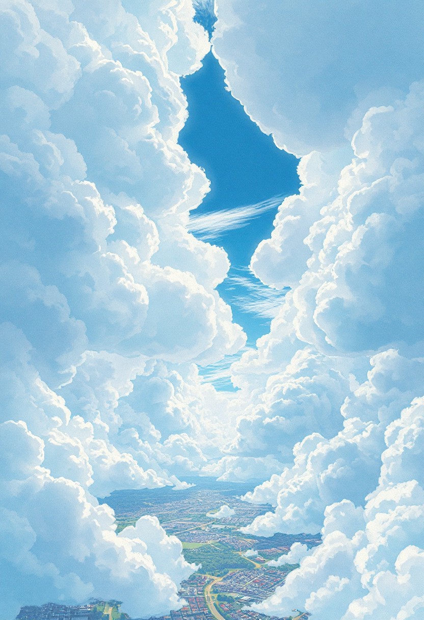 Vast anime-style sky with a massive textured cloud cover stretching across the entire scene, intricate structural cloud formations with detailed bumps and organic folds, scattered open gaps revealing patches of bright blue sky, cinematic view over a peaceful cityscape below, soft sunlight streaming through cloud breaks, pastel color palette (baby blue, soft white, light pink), highly detailed Ghibli-inspired artwork, hyper-realistic watercolor texture, dreamy and emotional atmosphere, 4K ultra-high resolution