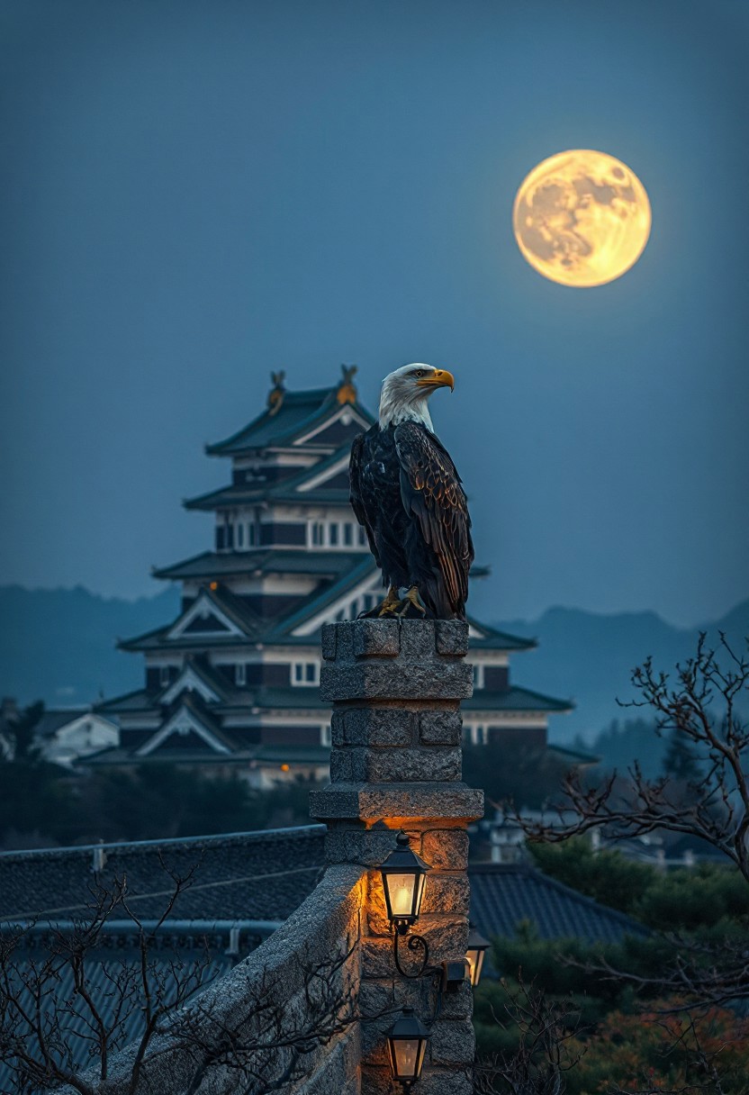 (Soft Lighting Photography by Mimoza Veliu and Mario Giacomelli:1.2), NSFW, an eagle sitting high on a Japanese castle wall. The background is of a Japanese castle, full moon, laterns, japanese garden.