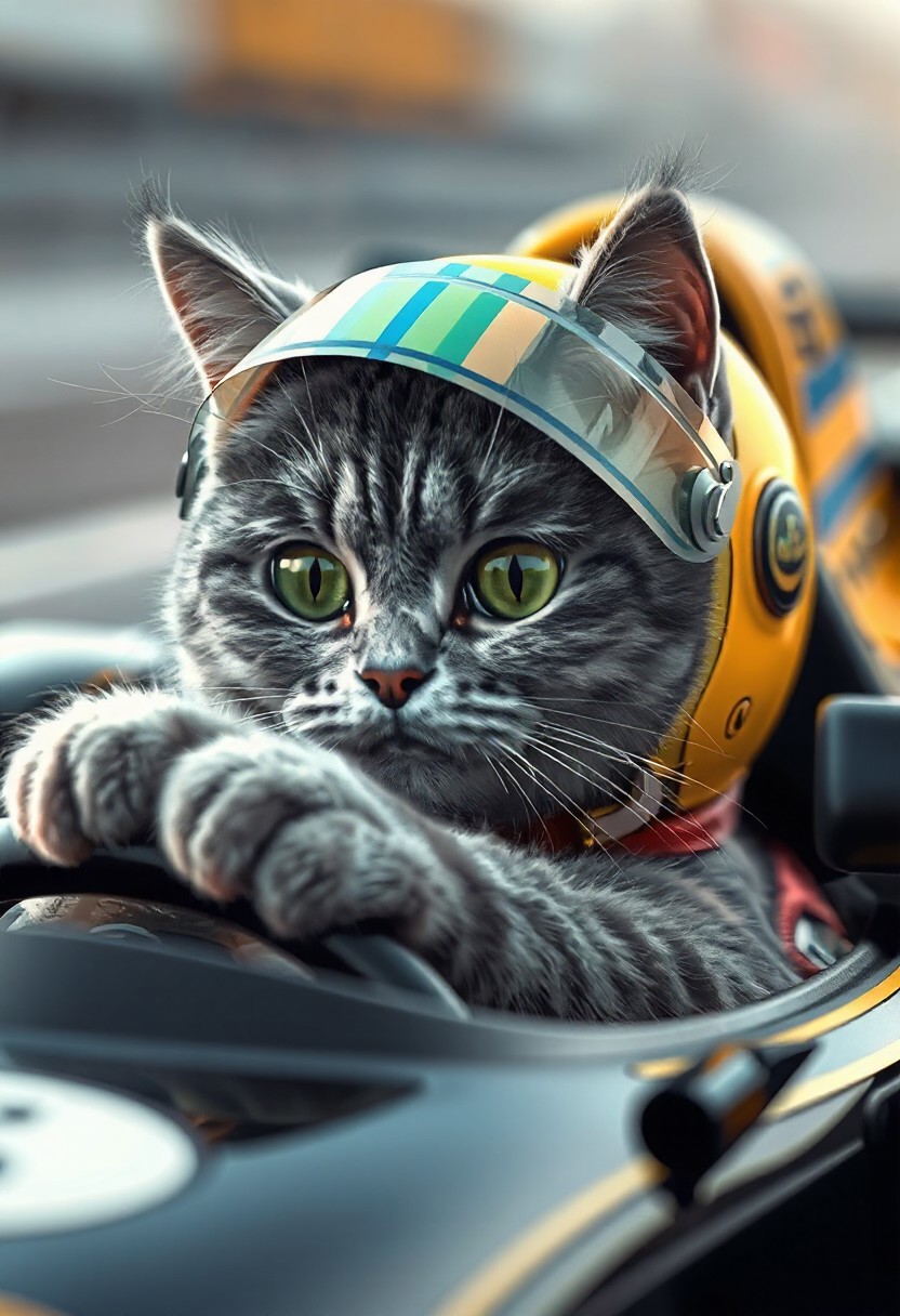 (masterpiece:1.2), (best quality:1.2), (realist), highly detailed, realistic texture, sharp details, extremely delicate and beautiful, realistic cg 8k wallpaper, cat driving a Formula1_car, [[gran prix]], [tabby cat], [[[grey cat, green eyes, white cheeks]]], focus on eyes, wind on face, high-speed drinving, cat using a helmet, [[[cat-ear_helmet]]], [[[paw on steering_wheel]]], [[[yellow helmet with blue and green horizontal lines]]], Ayrton Senna,[lotus t98],[lotus_racing], black car with gold details, [[[1980's formula one]]]. <lora:add-detail-xl:3>
