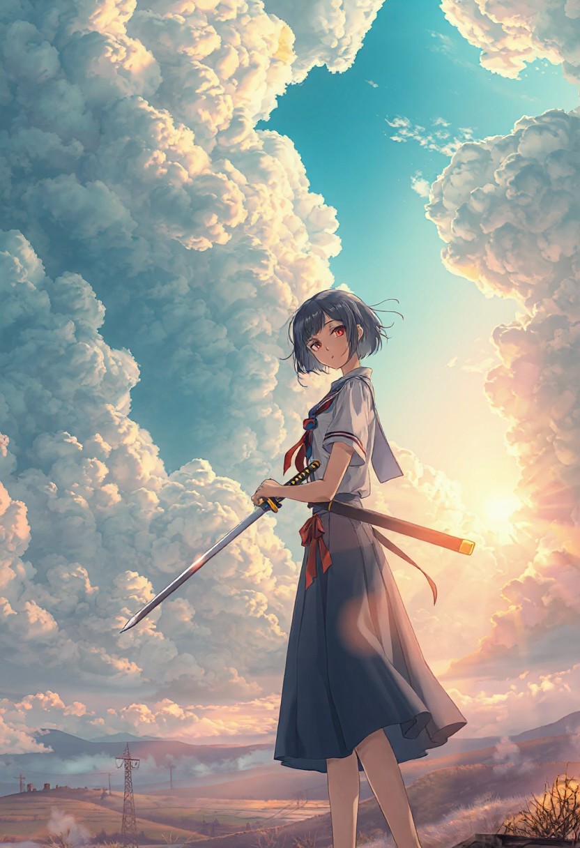 "Vertical 9:16 anime-style sky in ultra-detailed 4K resolution. A vast, painterly sky stretches endlessly, filled with massive, textured clouds in complex folds, subtle contours, and soft ridges. Gaps between the clouds reveal patches of baby-blue sky and warm sunlight beams filtering downward. Below, a mystical landscape fades into a dreamy blur. In the foreground stands an anime-style girl with shoulder-length dark hair and intense red eyes, inspired by Saya Otonashi from Blood+. She wears a traditional school uniform with a red ribbon and blue skirt, posed dynamically. She holds a katana with both hands in a ready stance, blade angled diagonally downward, tip glowing faintly, grip firm and focused. Her expression is serious and calm. Wind slightly lifts her hair and ribbon. Soft edge lighting surrounds her figure, with detailed cinematic lighting and subtle ambient haze. The color palette blends pastel blues, pinks, and golden sunlight, evoking a nostalgic, emotional atmosphere with ethereal, layered depth."