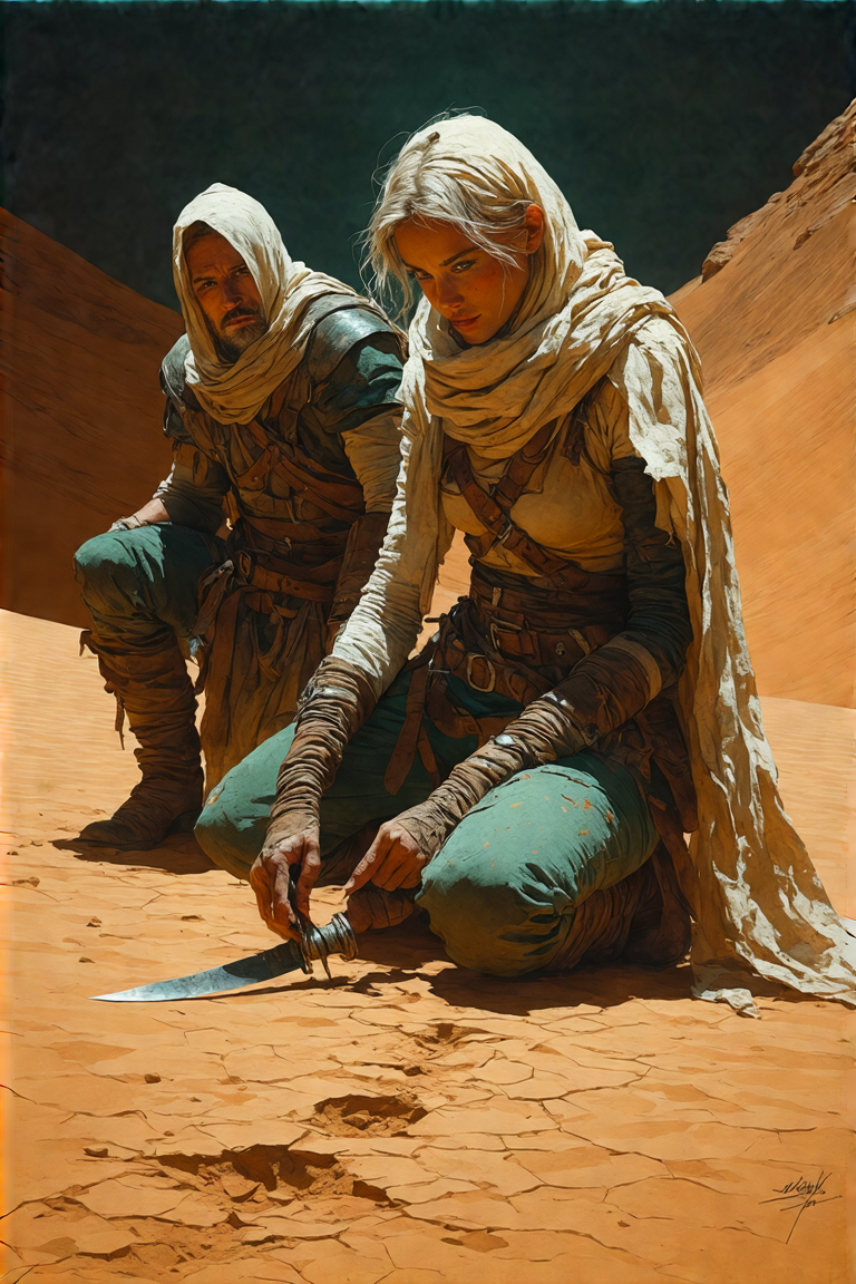 A weathered tracker kneels in cracked desert earth, fingertips tracing faint claw marks, her sun-faded scarf flaring against ochre dunes. Behind her, a broad-shouldered ranger in patched jade leathers leans forward, hand resting on a bone-handled knife, their shadows elongated by raking amber twilight. Hyper-detailed digital painting in Karla Ortiz's layered realism meets Jean-Baptiste Monge's earthy textures: sun-bleached leather grain, wind-etched sandstone, gossamer dust motes catching the last molten light. Sweltering stillness amplifies tension—a lone scarab skitters near the tracks, while distant storm clouds bruise the horizon, their electric charge humming beneath the tableau’s forensic focus.