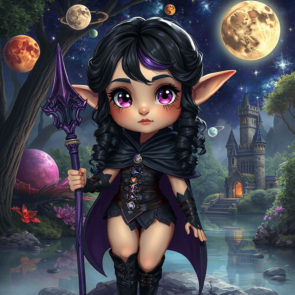 1girl, fantasy elf, long fantasy elven ears, natural lighting, realistic style, round cheek bones, full lips, small mouth, small nose, round face, black velvet boots laced with leather straps, petite, ((very thin waist:1.5)), body shaped like hourglass, long curled black hair with purple highlights, purple eyes, pupils showing, colourful planets and moon and stars and space in the background, a tome, zoomed out, full veiw, a sexy purple elven metal armor, wearing a purple magical staff, long black cloak, hyperealistic, fantasy castlle sitting in a magical jungle in the background, a lake in the background, cute face,