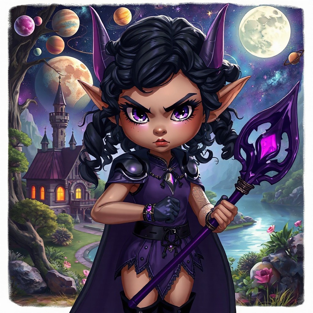 1girl, fantasy elf, long fantasy elven ears, natural lighting, realistic style, round cheek bones, full lips, small mouth, small nose, round face, black velvet boots laced with leather straps, petite, ((very thin waist:1.5)), body shaped like hourglass, long curled black hair with purple highlights, purple eyes, pupils showing, colourful planets and moon and stars and space in the background, a tome, zoomed out, full veiw, a purple elven metal armor, wearing a purple magical staff, long black cloak, hyperealistic, fantasy castlle sitting in a magical jungle in the background, a lake in the background, cute face, purple dress, angry look on her face,