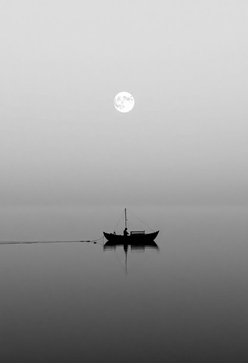 A minimalistic landscape, SILHOUETTED SMALL BOAT AND THE MOON by Michael Kenna.