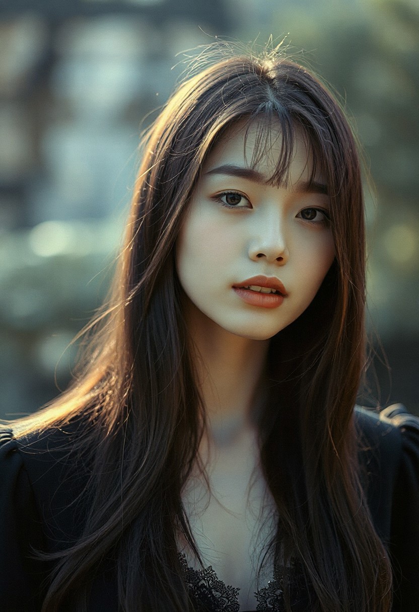 DLSR photograph, slender, beautiful 26 year old korean model . Pale skin, lighting<lora:MoriiMee_Gothic_Niji_Style_FLUX:0.3500000000000001> <lora:AsirAsianPhotographyflux:0.7000000000000002> "romantic facial portrait of the most beautiful glamour model ever, prim 20 year old woman, elegant long hair, highlights, (realistic skin details:1.2), blurry and out of focus in the background the washed-out colors of Cascade Saint Maurin and Pirates of the Caribbean as mere faint lights, photography by tony kelly and (george hoyningen-huene:0.7), cirque du' soleil meets edenic paradise, (face focus:1.2), award-winning avant-garde composition, sense of depth, blurry background, f1, blurry foregound, kodak portra photography, incredibly lifelike, subtle emergence of hedonsim, castaway survivor, (sexualized:0.2), (large breasts:0.3), vignette, romanticized, dramatic elegance, timeless beauty standard