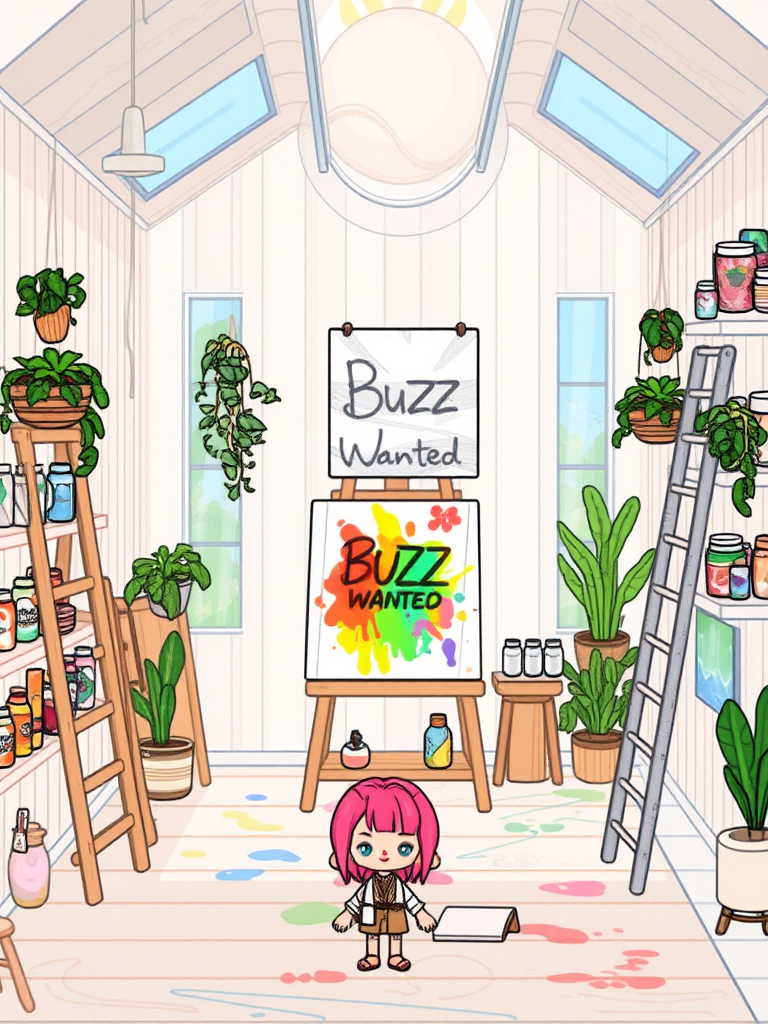 A high quality masterpiece full of details.In this vibrant cartoon illustration, a sunlit home studio bathed in natural light. The room features a large wooden easel with a splashy abstract painting in progress, surrounded by paint splatters on the light wooden floor. Books, jars, and various artistic supplies fill the white-paneled shelves against the wall. Potted plants drape from shelves and windows, adding a touch of greenery. Two artist ladders flank the space, with one holding a canvas. Two large skylights above and a table in the center make it an airy and creative workspace. Sunlight casts intricate shadows, enhancing the room's inviting and inspiring ambiance. One drawing hung on the wall writes with colorful paints: "Buzz Wanted" . A chibi cute girl with pink hair and excessively big eyes standing by the drawing