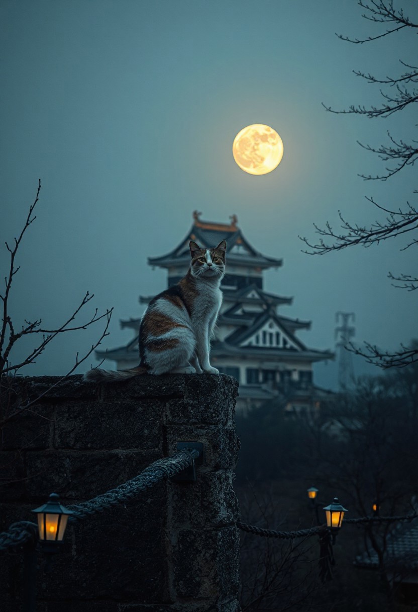 (Soft Lighting Photography by Mimoza Veliu and Mario Giacomelli:1.2), NSFW, a cat sitting high on a Japanese castle wall. The background is of a Japanese castle, full moon, laterns, japanese garden.