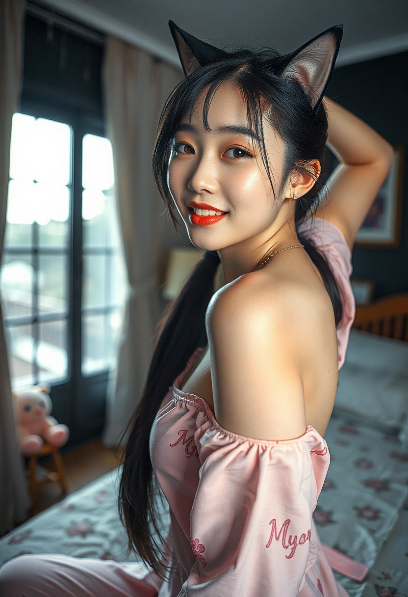 DSLR-style, slender, elegant 26-year-old Korean model, extremely pale skin with natural texture, soft shadow on cheek, diffused daylight from side, parted lips, masterpiece, ultra high-res <lora:NOOB_vp1_detailer_by_volnovik_v1:1> barely visible pores, subtle skin texture variation, translucent skin tone, full body. masterpiece,best quality,amazing quality, usnr 1 cat woman, adult, big boobs, pink ruby eyes, cat tail, tail band, cat ears, long ponytail, black hair, happy, shoulderfree, shoulders, (sideboob:1.1), open pajamas, printed pajamas, pink pajamas, dancing, arms up, wariza, (rainy foreground:0. 9), (open window in foreground:1.1), dark room, (large room:1.1), on bed, curtains, lamp, cute stuffed animals, (poster:0.9), (bookshelf:0.9), (black background:1.1), focus, looking at viewer, (from outside:1.1), (from above:1.1), from behind, ass focus, full body, low angle