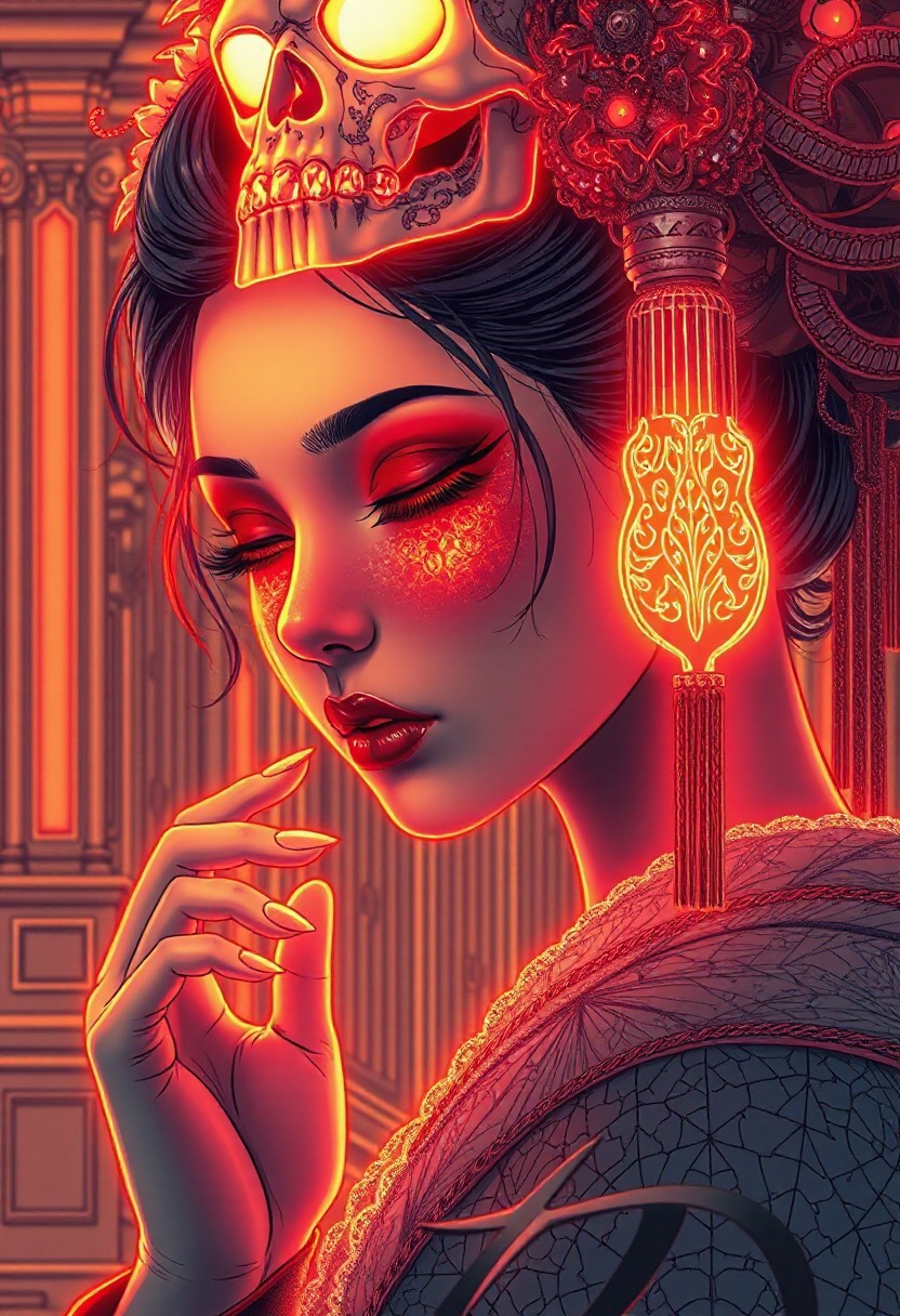 A highly detailed, intricate line-art illustration in the style of Steve McDonald. Detailed hyper realism in the visible body parts (face, hands, legs). 3D rendering, face close-up, CG high model, Elegant [goth geisha] with neon glowing makeup and a holographic skull headdress, in a [red and gold] cyberpunk aesthetic, dark fantasy, anime-style, illuminated by soft neon lighting , acrylic painting in style Adam Hughes. The composition features mesmerizing line work, fine architectural detailing in the background, and a play of light and shadow through intricate hatching. The overall aesthetic is serene, introspective, and dreamlike, blending realism with a highly structured, almost meditative pattern-based design.