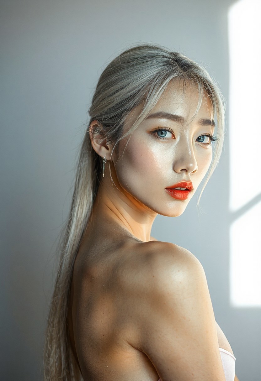DSLR-style portrait of a slender, elegant 26-year-old Korean model, translucent pale skin with natural texture, soft shadow on cheek, diffused daylight from side, parted lips, clean background, solo, masterpiece, ultra high-res <lora:NOOB_vp1_detailer_by_volnovik_v1:1> barely visible pores, subtle skin texture variation, translucent skin tone IllusP0s, cowboy shot, ((action pose:1.4)) BREAK 1girl, (long legs:1), ((skinny body:1)), (solo), (huge breasts), (earrings), blue eyes, white hair, long hair, (parted bangs, half updo, straight hair), ((sexy dress:1.6)) BREAK milf, charming, alluring, seductive, enchanting, detailed background, inside.