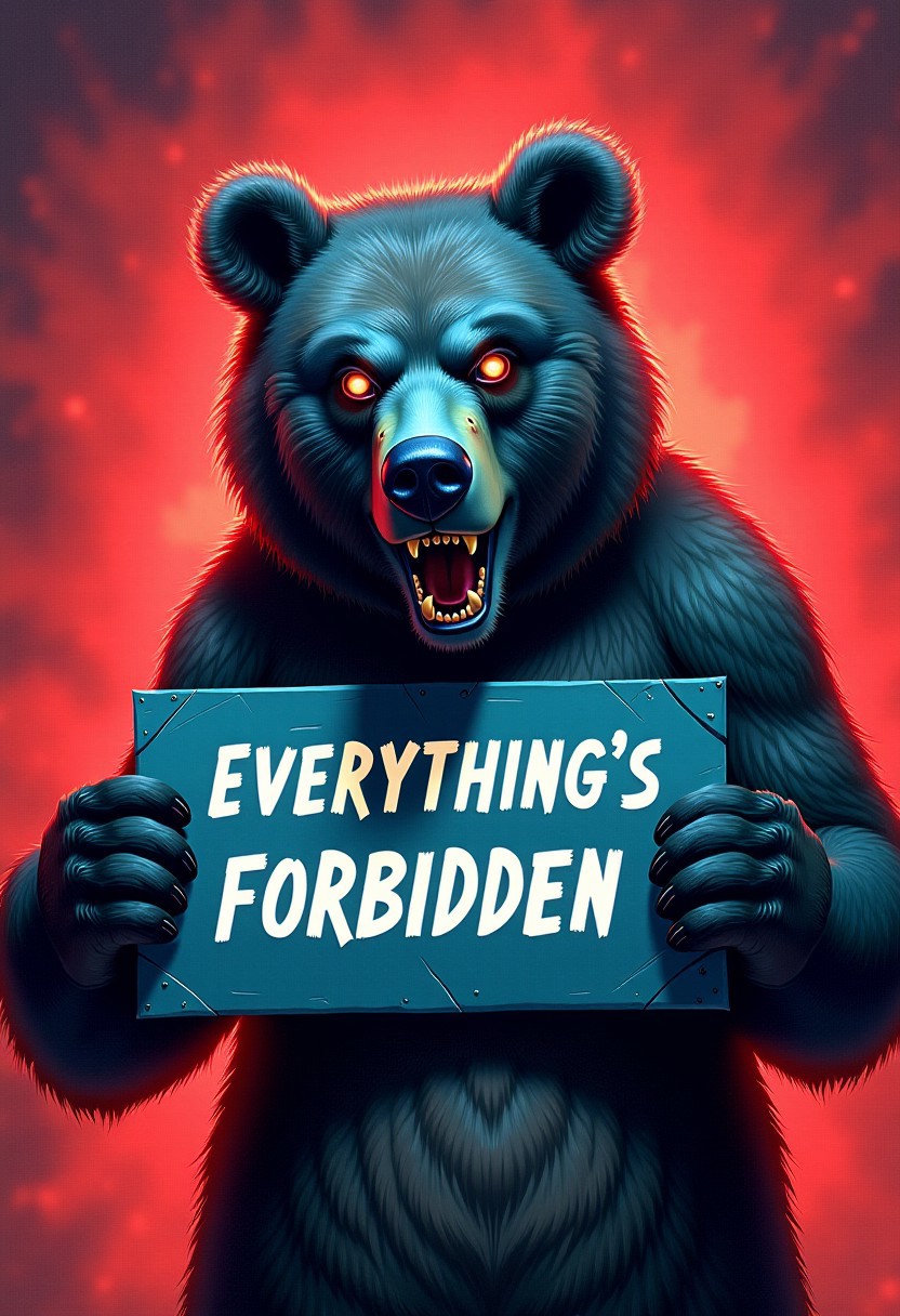 A haggard unkempt anthro grizzly bear is holding a sign saying "EVERYTHING'S FORBIDDEN". Dramatic but simple composition, exaggerated shocked expression, stylized neon splash graphic novel look, low frequency patterned background, end of the world!