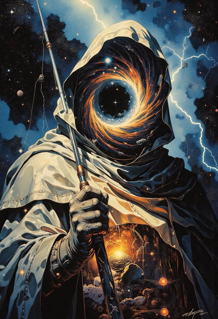 A surreal, symbolic portrait of a cosmic fisherman from the chest up—but instead of a face, there is a swirling void of stars and color, like a miniature galaxy spiraling where his head should be. Nebulae twist in place of features, and distant lightning arcs silently across the stellar mass. His hood or hat hovers over the void, held aloft by invisible force, stitched with constellations and rimmed in glimmering cosmic dust. His cloak flows like liquid space, rippling with the motion of orbiting satellites and comet trails. In his gloved hands, he holds an impossibly long fishing rod made of collapsed light and crystalline filaments, casting into unseen dimensions. The chiaroscuro lighting bathes his form in stark contrast—one side lit by a rising blue-white star, the other lost in the depths of black space. The image is rich with layered textures, glowing embers, and fractal shadows, blending realism with high-concept cosmic surrealism.