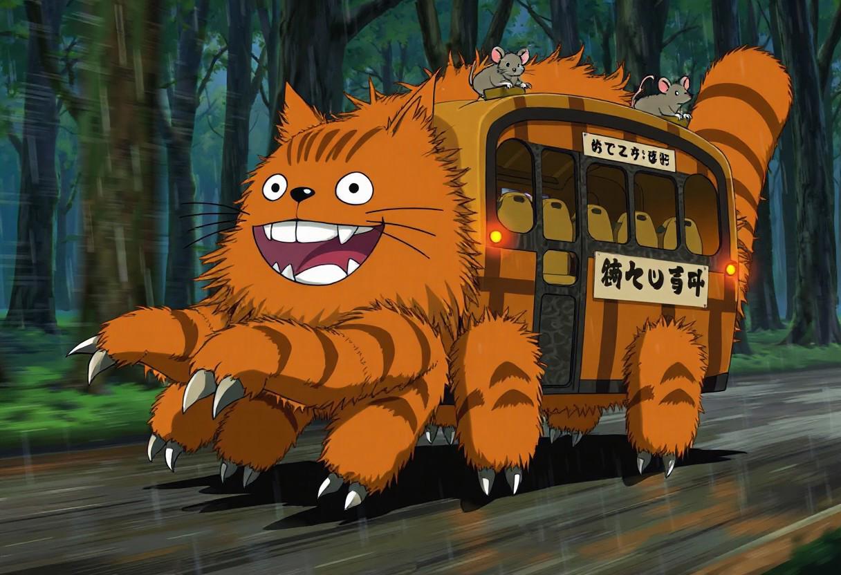 Hairy Catbus from then anime Tonari no Totoro. Ghibli studios anime style. The hairy catbus with teeth from the miyazaki anime My neighbour totoro, with a sign on the side of the catbus reading "Buzz Tickets". Miyazaki anime style. miyazaki anime style background in a wood. rainy day. The hairy catbus is moving fast through the wood. The Catbus, a character in My Neighbor Totoro, is depicted as a fantastical combination of feline and bus attributes. It features a large, wide-grinning cat head, twelve legs resembling those of a cat, complete with sharp claws, and a bushy tail. The body of the Catbus is designed to resemble a bus, with a framework that includes a hollow interior lined with fur-covered seats and a shape-shifting door for passenger boarding. The eyes of the Catbus function as headlights, and it has mice with glowing eyes positioned on its upper front, serving as taillights. The fur of the Catbus is orange with brown stripes adorning its back, forehead, legs, sides, and tail.