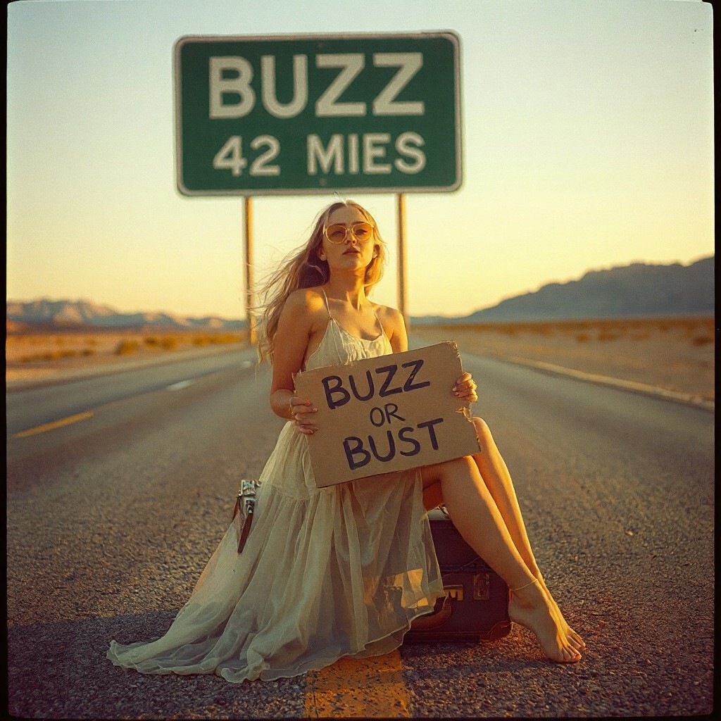 <lora:retrofilm_V02:1> analog film photo ,faded film, desaturated, 35mm photo, Hasselblad 501 camera, grainy, vignette, vintage color film, Lomography, stained, highly detailed, film border, thin photo border, vintage photograph, 1960s vintage photo, (masterpiece, best quality, ultra photorealistic, 8K, cinematic lighting, shallow depth of field), bokeh, A young woman on lone desert road stretching through Death Valley. she is is sitting on an old vintage suitcase on the side of the road holding a cardboard sign with writing that says “BUZZ OR BUST”:0.8, Golden hour, sunset, rim lighting, light rays, light particles, large road sign with white lettering on green background says “BUZZ 42 MILES”:1.9, thin white summer dress:0.7, see through dress, gently blowing in the soft breeze. Her long blonde hair moves naturally with the wind, catching the warm sunlight, (realistic skin:1.3), yellow lens sunglasses:0.5, large full round breasts, no bra, wide hips, long toned legs, She wears a short flowing summer dress, high leg slits,