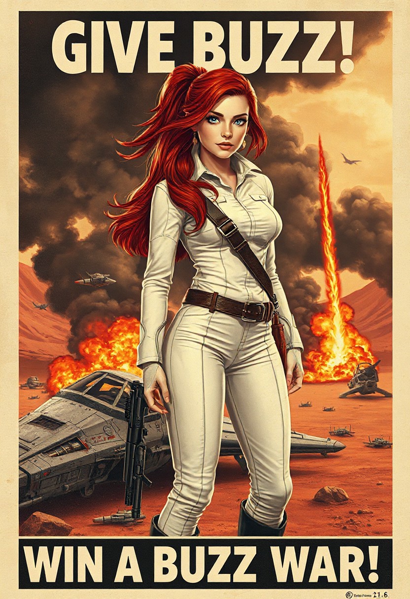 (Star Wars style), (old style propaganda poster), text on top of poster says “GIVE BUZZ!”:1.4, text at bottom of poster says “WIN THE BUZZ WAR!! “:1.8, (long red hair, crystal blue eyes, full pouty lips, small perky nose), Elegance and poise, standing next to her crashed Star fighter which is on fire and billowing dark smoke, Her long deep-red hair pulled into a loose ponytail, windblown hair, alert in the middle of a battlefield on a distant desert planet, explosions in the sky, crashed space fighters crashed and burning in the distance, Her shapely form was perfect in the skin tight white uniform is torn exposing her toned midriff, toned abdomen, The pistol she wore looked like something from an old western. Leather holster on her right hip, The scar under her left eye was hardly noticeable, but also a warning. She was tough abd beautiful. Her perfect face and blue eyes sparkling with iridium dust let you know she had augmented strength behind her delicate frame. Medium round breasts, braless, wide hips, long toned legs, black leather boots,