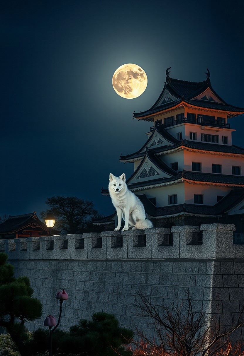 (Soft Lighting Photography by Mimoza Veliu and Mario Giacomelli:1.2), NSFW, a white fox sitting high on a Japanese castle wall. The background is of a Japanese castle, full moon, laterns, japanese garden.