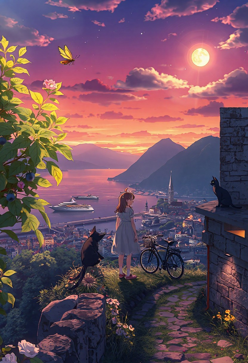 Vertical 9:16 cinematic anime frame, ultra-detailed 4K, vibrant and rich color palette, sharp lighting contrast. Vordergrund: blühender Kirschbaumzweig links, Schmetterling schwebend darüber; rechter Bildrand mit halb verwelktem Zaun und Grashalmen im Wind, kleiner umgefallener Getränkebecher mit glänzender Oberfläche. Vor-Mittelgrund: schwarzer Kater sitzt auf einer Steinmauer, Blick nach oben, neben ihm eine halbvolle Glasflasche mit Lichtreflexion; darunter bunte Gänseblümchen am Boden. Mittelgrund: ein Junge und ein Mädchen stehen auf einem kleinen Hügel mit gepflastertem Weg; sie trägt ein Sommerkleid, er ein Fahrrad schiebend, beide schauen in die Ferne, friedlich, Haare im Wind, klarer Fokus. Hintergrund: flache Küstenstadt mit erleuchteten Fenstern, Kirchturm und Laternenpfählen; hinter der Stadt das ruhige Meer mit einem entfernten Kreuzfahrtschiff, Lichter reflektieren auf dem Wasser. Hinter-Hintergrund: gro﷿e Gebirgskette unter einem weiten Sternenhimmel. Himmel: tiefe Dämmerung in violett-orange, gro﷿e weiche Wolken im oberen Drittel, strahlender Vollmond leicht links oben, halb verdeckt von einer Wolkenschicht, mit subtiler Korona. Soft bloom, cinematic lighting, parallax-ready composition with strong sense of layered depth, feenstaub gently floating across all depth layers, cel-shaded in Makoto Shinkai style.
