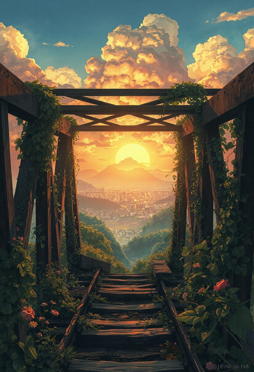 Vertical 9:16 cinematic anime scene, viewpoint from an old abandoned railway bridge, lush vines and flowers growing through the broken wood, distant glowing cityscape visible beyond a misty valley, massive golden sunset clouds above, hyper-detailed soft watercolor anime style, pastel tones (warm oranges, faded greens, soft blues), emotional dreamy atmosphere, gentle breeze moving the vines.