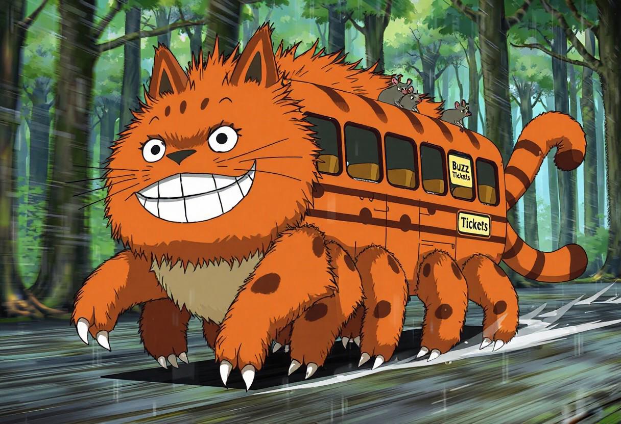 Hairy Catbus from then anime Tonari no Totoro. Ghibli studios anime style. The hairy catbus with teeth from the miyazaki anime My neighbour totoro, with a sign on the side of the catbus reading "Buzz Tickets". Miyazaki anime style. miyazaki anime style background in a wood. rainy day. The hairy catbus is moving fast through the wood. The Catbus, a character in My Neighbor Totoro, is depicted as a fantastical combination of feline and bus attributes. It features a large, wide-grinning cat head, twelve legs resembling those of a cat, complete with sharp claws, and a bushy tail. The body of the Catbus is designed to resemble a bus, with a framework that includes a hollow interior lined with fur-covered seats and a shape-shifting door for passenger boarding. The eyes of the Catbus function as headlights, and it has mice with glowing eyes positioned on its upper front, serving as taillights. The fur of the Catbus is orange with brown stripes adorning its back, forehead, legs, sides, and tail.