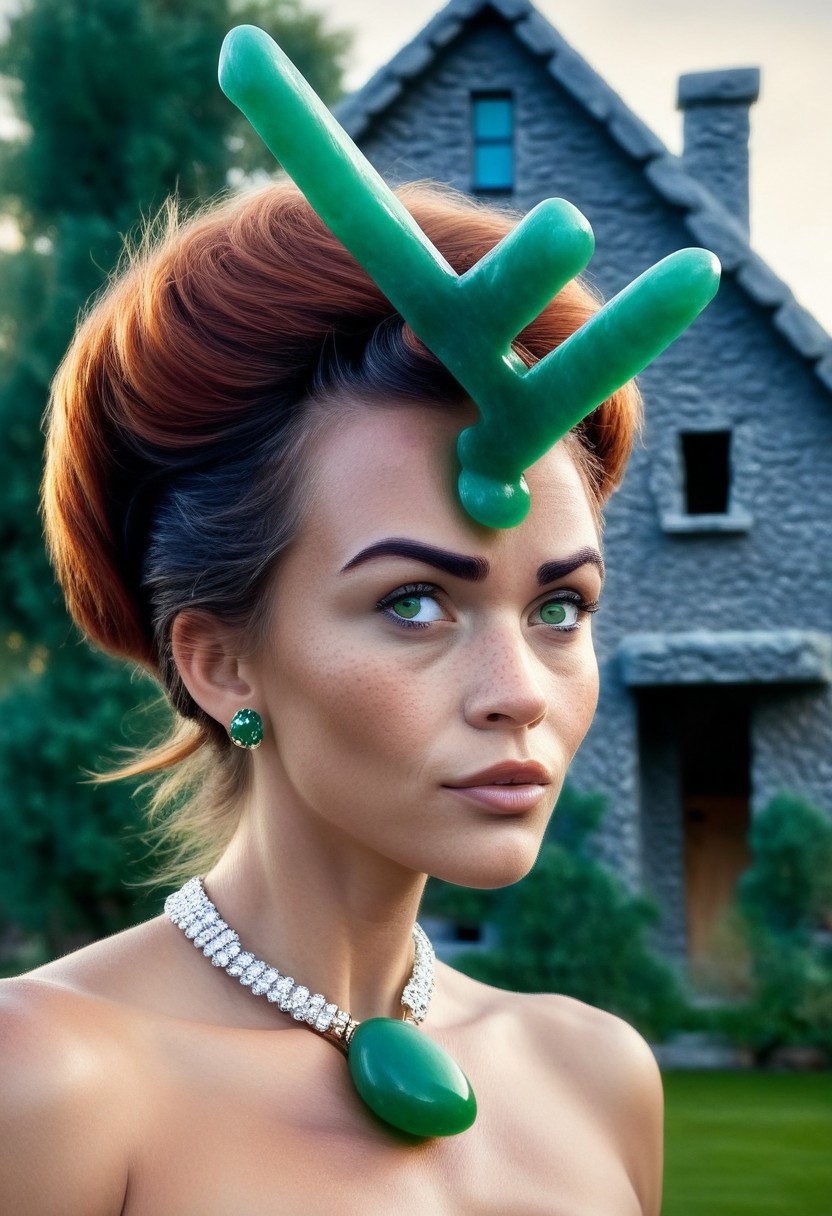 Obsidian Jade Style, 1girl, (sharp focus:1.2), round cheeks, upturned nose, (detailed eyes:1.1), (luscious lips:1.1), (large eyes:1.0) (chestnut hair:1.2) (moody lighting:1.2), depth of field, bokeh, 32K, HDR. hyper realistic, realistic eyes, (absurd res:1.1), beautiful lighting, sunlight, score_9, score_8_up, score_7_up, score_6_up, masterpiece, high quality, (best quality:1.1), milf, 1girl, gentle smile, tiara, medallion, Highly detailed beautiful expressive eyes. Glamorous Textured hair. Mischievous Smirk. Light makeup. Studio lighting. Photorealistic, Natural atmospheric lighting, intricate details, 35mm photograph, film, professional, sublime visuals, highly detailed, elegant, studio quality, (wears a bearskin:2), perfect body and face, absolutely outstanding image, cute fine face, fitness model, (jade Flintstones house:4), outdoors, (Jade ax:4).
