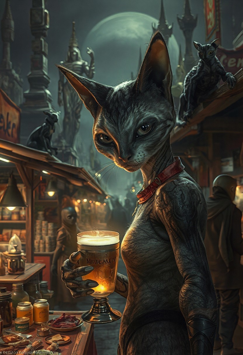 Setting is an extraterrestrial alien street market at night in a city of an extremely advanced extraterrestrial civilization, ((all writing is in an alien script)), ((all lighting is exotic and of an extremely advanced technology., the market is comprised of street vendors selling food, exotic technological wonders, and alien clothing. (((The extraterrestrial beings in view have a variety of appearances some are human-like, others are insectoid or feline or canine or reptilian, they are wearing a variety of clothing are walking through the street market shopping and eating))), A black cat with red collar sits on a nearby wooden roof at a market kiosk. Behind the a kiosk counter are containers of exotic goods, (((a beautiful furry alien anthropogenic cat-like being, 24 years old, is standing in the foreground facing the viewer with a glowing metal goblet of beer in her paw/hand. Her eyes are beautiful and focused on the viewer, she has an expression of interested curiosity))), the being is dressed in exotic style clothing of a completely exotic aesthetic. Enormous metallic statues and temples are visible in the background and around the scene and smaller statues are prevalent in the market, Epic image that elicits a feeling of wonder and awe, (((many types of aliens are walking around the market but NO HUMANS)))