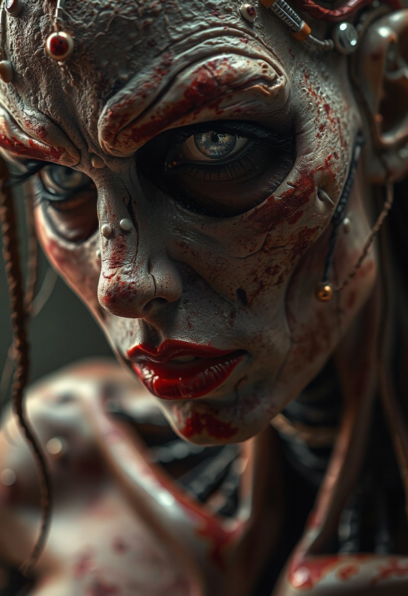 (highres, masterpiece:1.3), SHARP, CRU, HDR, 32K, ultra detailed, realistic, intricated, full body picture of a gorgeous biomechanical zombie realistic woman, red lips, highly detailed and textured, dutch angle, very realistic and impressive, fantastic dramatic color.