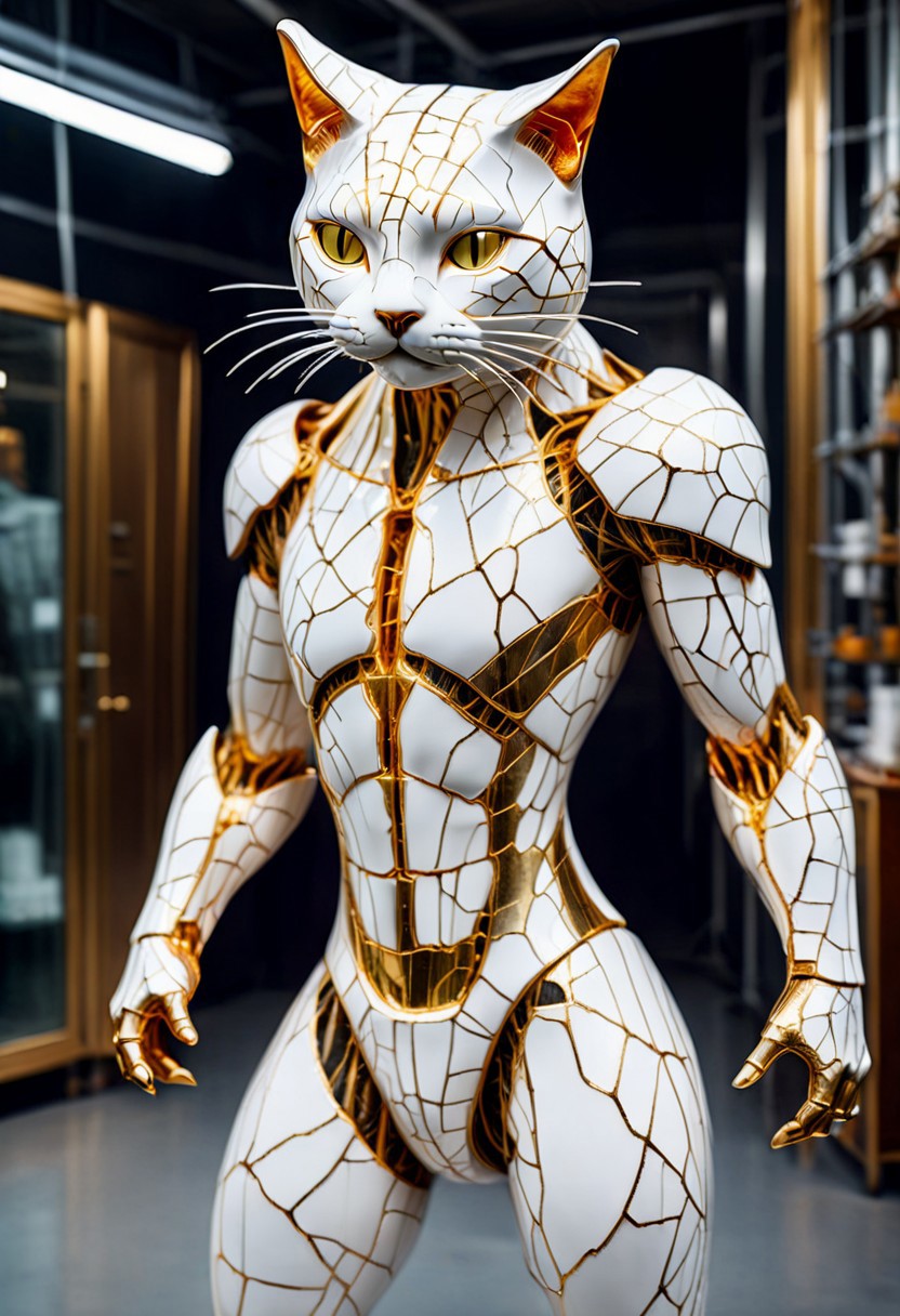 A cat jazz star, sleek metallic limbs intertwined with living muscle and mossy fur, wearing reflective sunglasses that mirror a galaxy in upheaval. Slung over its back — a glowing, saxophone pulsing with energy, shaped from bone and chrome. The cat sits amid the aftermath of a tiny, hidden celebration — Expression: daring, unbothered — a rebel bard of the new metallic age. Background: a surreal tulip garden made of Porcelain, petals glowing golden with bioluminescent energy. Flowers flicker with arcs of electricity. Raining softly — reflections shimmer on the cracked transparent ground. A hollow bioluminescent shell, cracked and glass-like, hovers nearby — mysterious and symbolic. Lighting: magical realism with golden hour sunlight blending into cool golden and blues. High contrast, ethereal glow, dreamy soft focus. porcelain tones and elegant gleam create tension. A faint glowing halo outlines the cat’s silhouette — a symbol of its mythic transition. Style: masterpiece, best quality, intricate detail, official-like tone. Mysterious background with scattered porcelain plants, surreal lighting, fascination and wonder in the air.