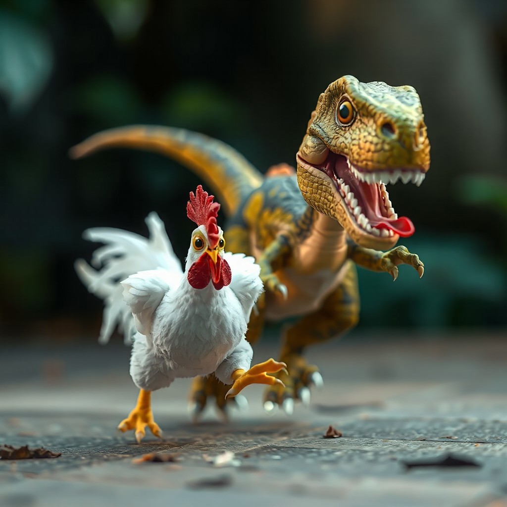 A baby dinosaur raptor running after a white rooster. They are both in the style of toy story. The raptor has his tongue out to the side and the white rooster has his eyes bulging and running away in fear towards the camera