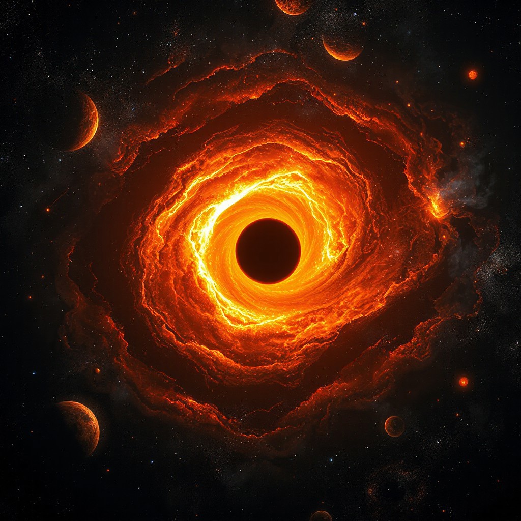 Ultra-realistic, masterpiece,amazing quality, black hole with orange light, black hole is sucking in any light around it, the vast space of the universe with dozens of suns, nebulas and a supermassive black hole in its center, brilliant shining stars around it, a mesmerizing picture, engaging, compelling composition,