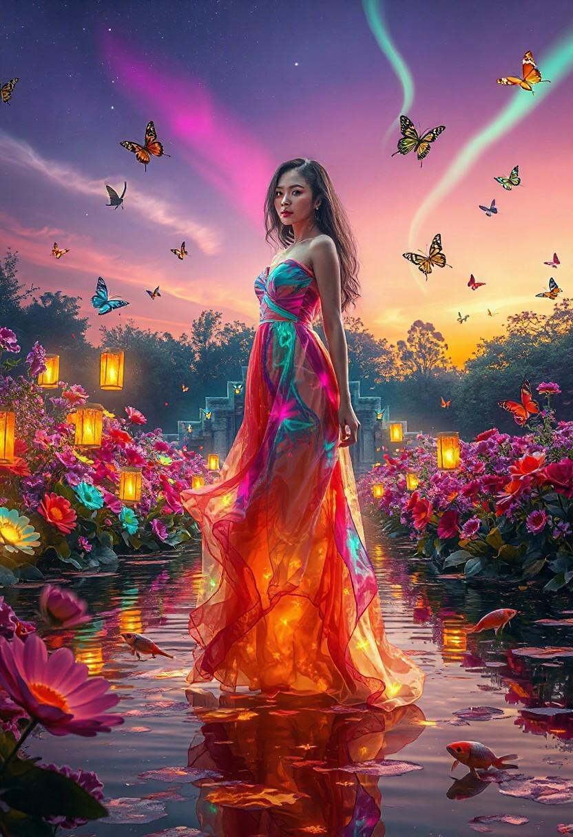 woman in flowing dress, full body, dress with swirling colors, neon pink, electric blue, fiery orange, glowing accents, standing in surreal garden, rainbow-hued flowers, petals glowing, violet, turquoise, crimson, floating lanterns, golden light, shimmering pond, reflective surface, multicolored fish, leaping playfully, vibrant butterflies, emerald and ruby wings, sky with gradient hues, lavender to sunset gold, faint aurora, green and magenta streaks, air filled with floral scent, ultra-detailed, 8k, realistic, hyperrealistic, very detailed atmosphere, high contrast, score_10up, score_9up, score_8up, artistic colorful scene
