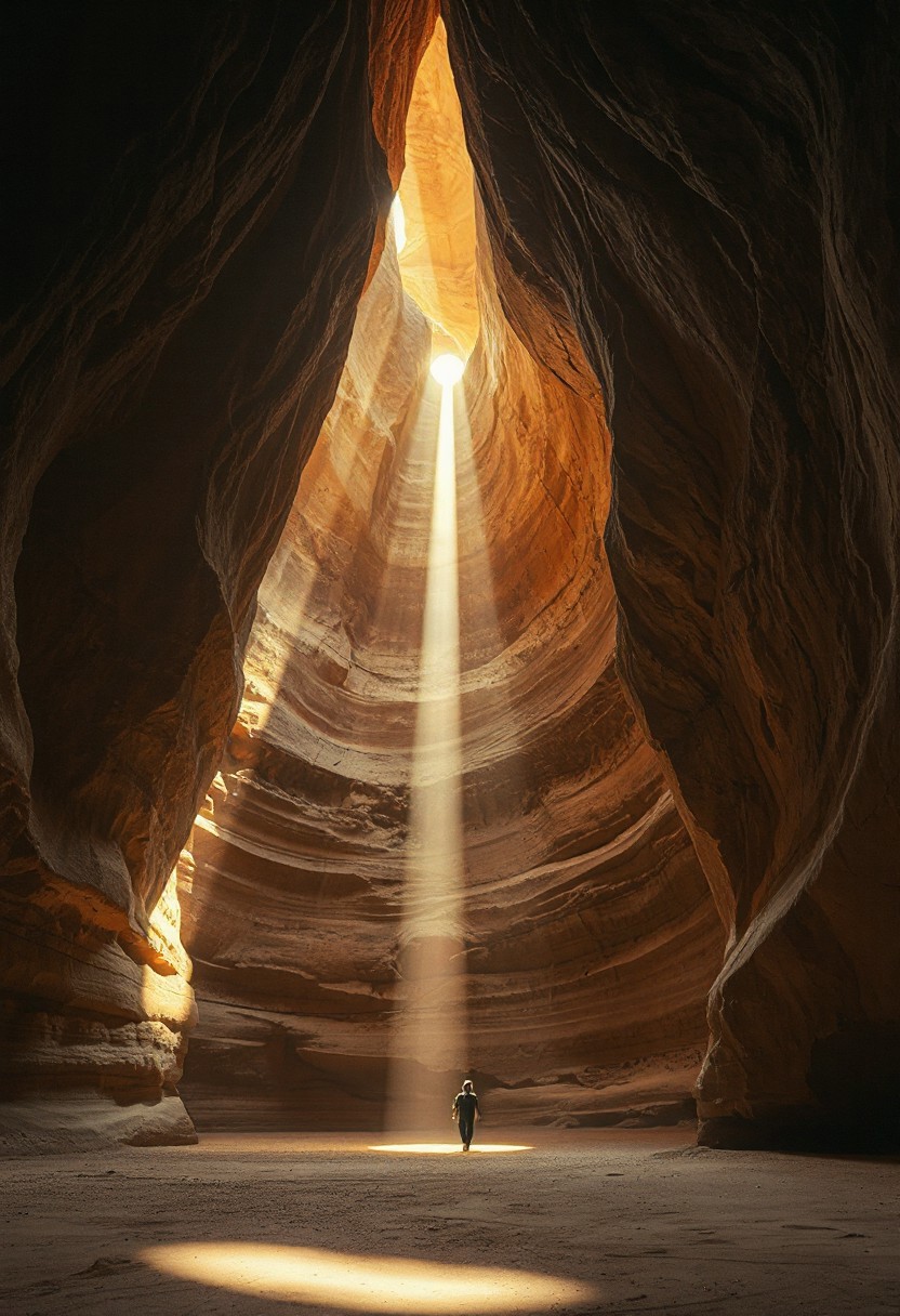 Inside a gigantic eroded desert cave, a small distant human silhouette framed by the intense sunlight at the top entrance, intricate sandstone patterns along the tall walls, fine dust hanging in the golden beams, hyper-realistic 9:16 vertical framing, vast empty space emphasized, emotional atmosphere of solitude and ancient mystery, shot with cinematic depth and vertical grandeur"