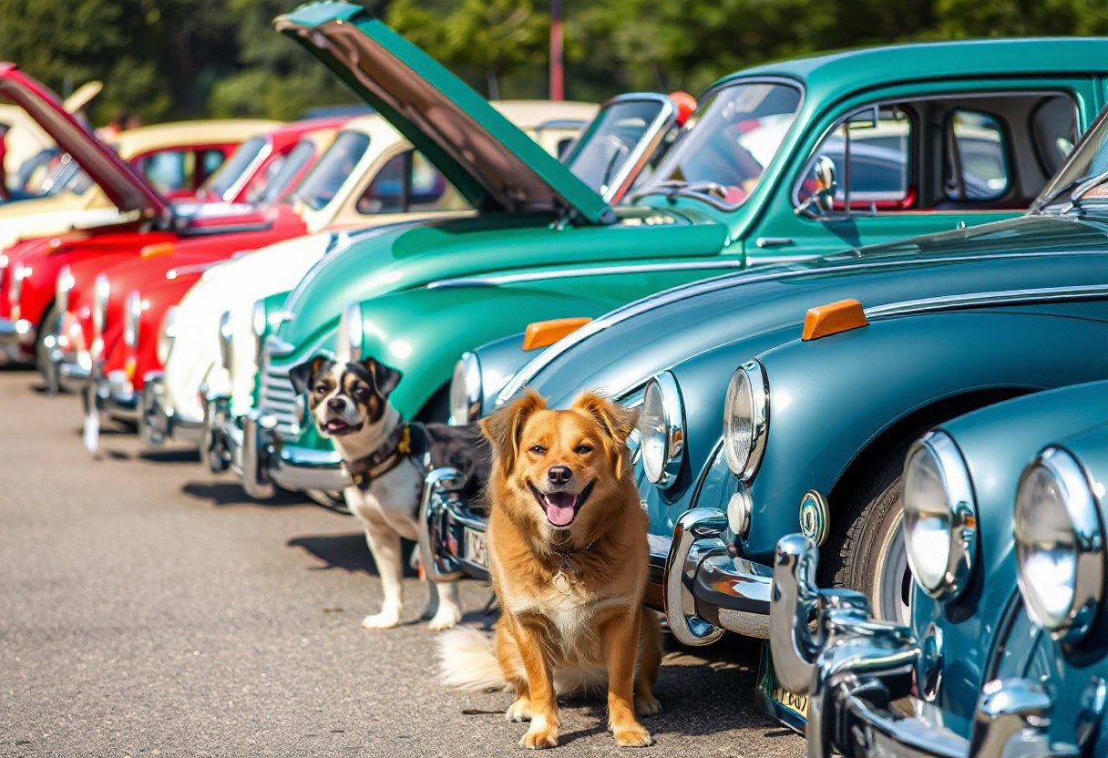 classic car show, lined up in a row, different breed of show dog in front of each car,