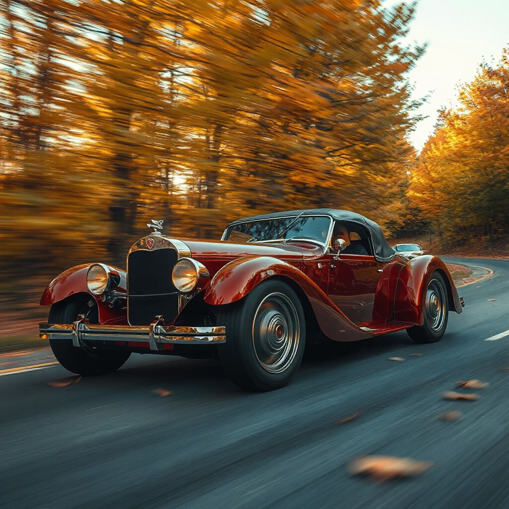A scenic shot of an Autumn road as a steampunk style sports care drives on the road blowing colorful Autumn leaves around it in a blur of speed. the Sports Car is a hybrid of an old Model A, 1960's swift back muscle car, and a neo modern angle with rounded hood styling. Its body panels shine and glimmer as if composed of a magic dark red paint, creating an aura of magic as it races forward in a blur of shimmering lines.