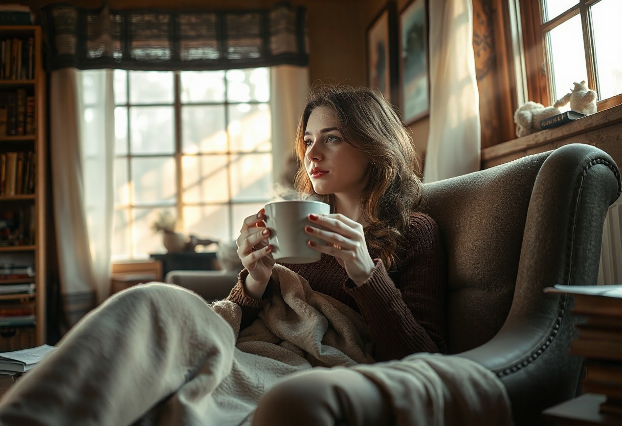 A high quality photo of a beautiful young woman sitting in arm chair in a cozy cottage, she is drinking a large ceramic cup of hot tea that is steaming, holding cup with both hands, she has thin blanket around her and is sitting relaxed with her legs up, blanket over feet, cozy, looking out the window, sunbeams through the windows, dust in the air, effortlessly chic, beautiful, serene, detailed, slightly cluttered environment with books and paper. High detail, heavy use of depth of field, 4k, super realistic, real photo, shot on Canon, camera