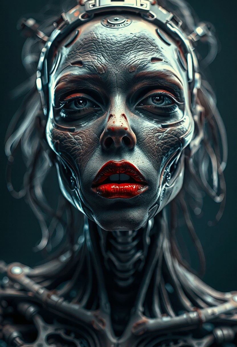 (highres, masterpiece:1.3), SHARP, CRU, HDR, 32K, ultra detailed, realistic, intricated, full body picture of a gorgeous biomechanical zombie realistic woman, red lips, highly detailed and textured, dutch angle, very realistic and impressive, fantastic dramatic color.
